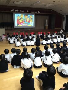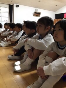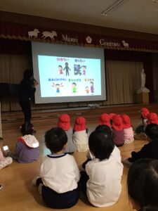 訓練後お遊戯室に集まりました。話を聞いたり、映像を見たり、「い・か・の・お・す・し」という標語も教えてもらいました。