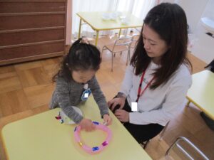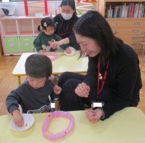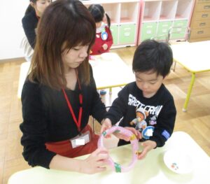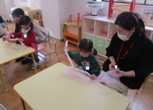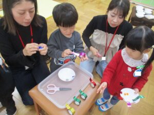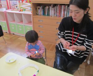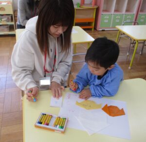 おうちの方と一緒に、先生の話を聞きながら、半分に折ったり、指先でおさえたり…みんな上手にできました!!