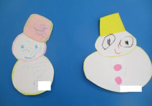 白の画用紙にクレパスで〇を2つ描いて、おうちの方にハサミ✂で〇を切ってもらったり、帽子や手袋なども好きな色の画用紙を選んで作って,最後にクレパスで顔を描いてかわいい雪だるまができました(*´▽`*)