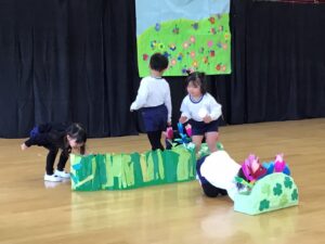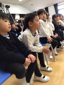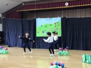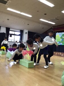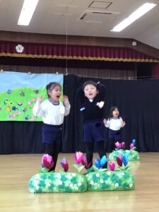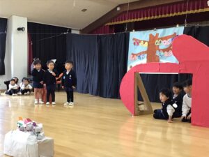 「かわいいねずみ出てきたで!」「うさぎさん(ひまわり組と)一緒やな!」「うわ!(あの動物)こわい顔してはるなあ!」などそれぞれの劇遊びを見ながら感想が飛び出してきました。