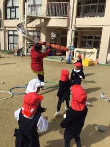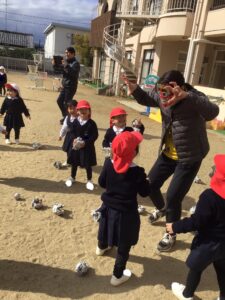 園庭遊びの途中で鬼が2体も出てきて、子どもたちは大興奮!
