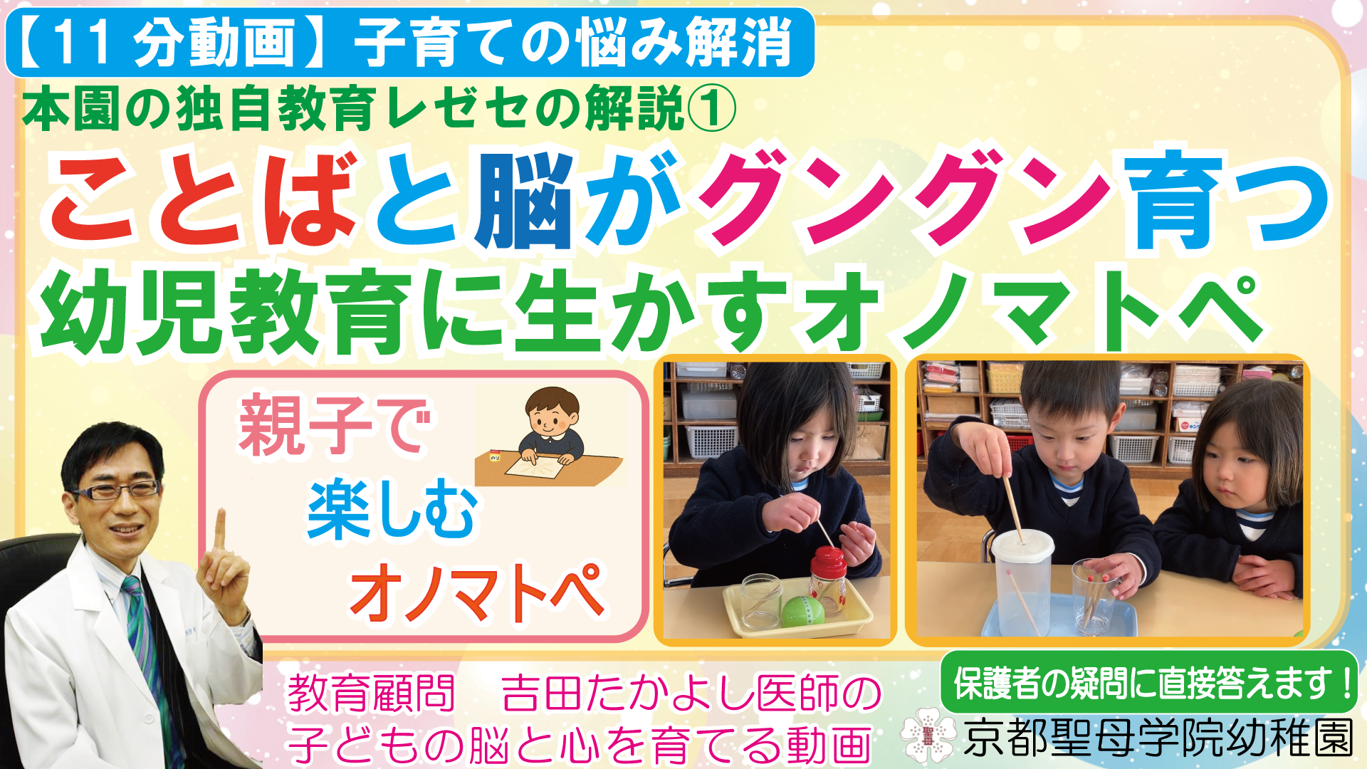 【動画】ことばと脳がグングン育つ 幼児教育に生かすオノマトペ 投稿日:2026.01.30 本園独自教育の動画(園児の作業動画有り)を更新いたしました。 ことばと脳がグングン育つ 幼児教育に生かすオノマトペと題して 吉田たかよし先生に解説頂いております。ぜひご覧ください。 ↓クリックしてください。