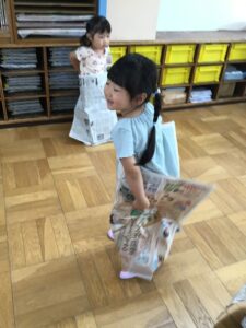 新聞紙を広げ、「ひらひら~」と揺らしたり腰に巻いたりして