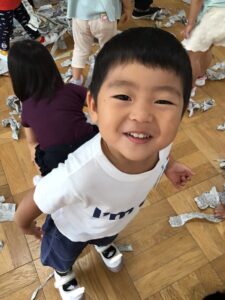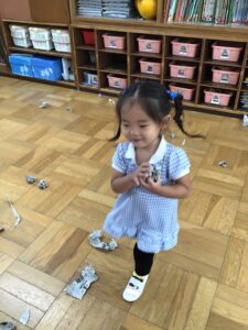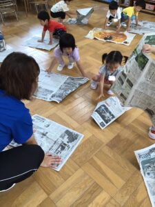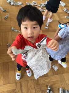 新聞紙をびりびり破くことは、手指を使う活動です。楽しみながら指先をコントロールする力が備わります。💕