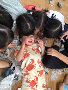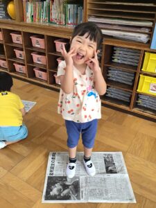 大きい新聞紙を半分に折っていくと「小さくなってきたね~」と上に乗ったり
