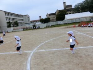 まずは徒競走!お遊戯室や園庭よりも大きい場所で走れるのがとても嬉しそうでした。