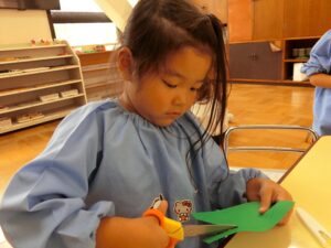 はさみで葉っぱを切りました。どんなお面ができるかな?