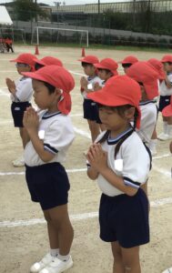 年長組は、入場行進のときに旗を持って先導したり『お祈り』や『ちかいの言葉』のときに前に出たり、