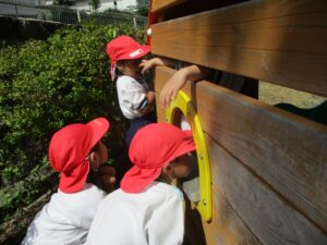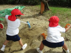 園庭では、お友だちと園庭のあちこちへとお散歩したり、かくれんぼをしたり…。園庭では工事の真っ最中♪