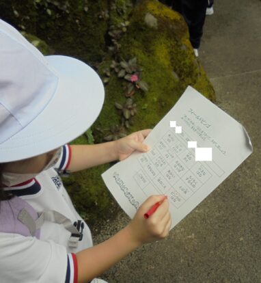フィールビンゴでは、植物の特徴をしっかりと観察していきました。「あかい花を見つけたよ!」「なんだかいい匂いがする!!」「きゅうりみたいなサボテンがあるよ!」など、見つけたものを嬉しそうに教えてくれました。ビンゴカードの裏に、植物の名前を書いて覚えたり、お気に入りの植物の絵を描いたりして楽しんでいる姿もありました。