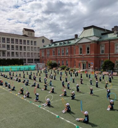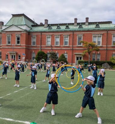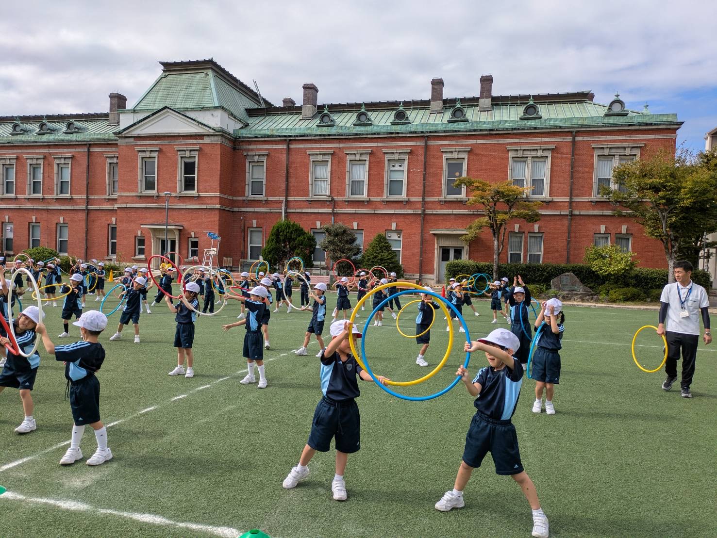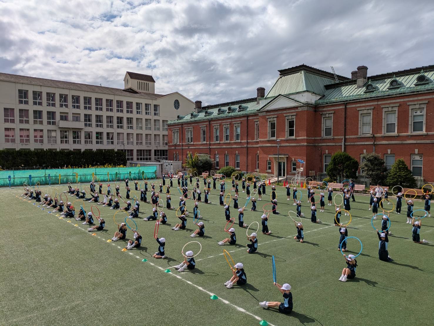学年演技には、フラフープを取り入れています。「腰回し」「腕回し」「フープジャンプ」「コマ回し」の4つの技を、音楽に合わせて組み合わせています。