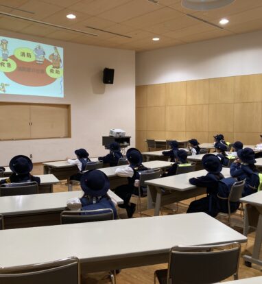 講堂に入ったグループは、消防士さんの普段のお仕事や火事に関する資料を見ながら、命を守るお仕事について学びました。