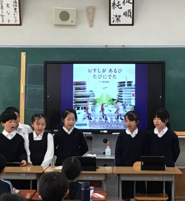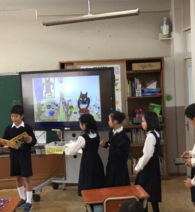 練習以上にしっかりと声も出し、班で協力しながら読み聞かせをする子どもたちの言葉に、1年生は静かに耳を傾けていました。せりふが出てくる場面ではなりきって表現します。すると、1年生もにっこり。どの1年生もお話を聞いていて楽しそうでした。