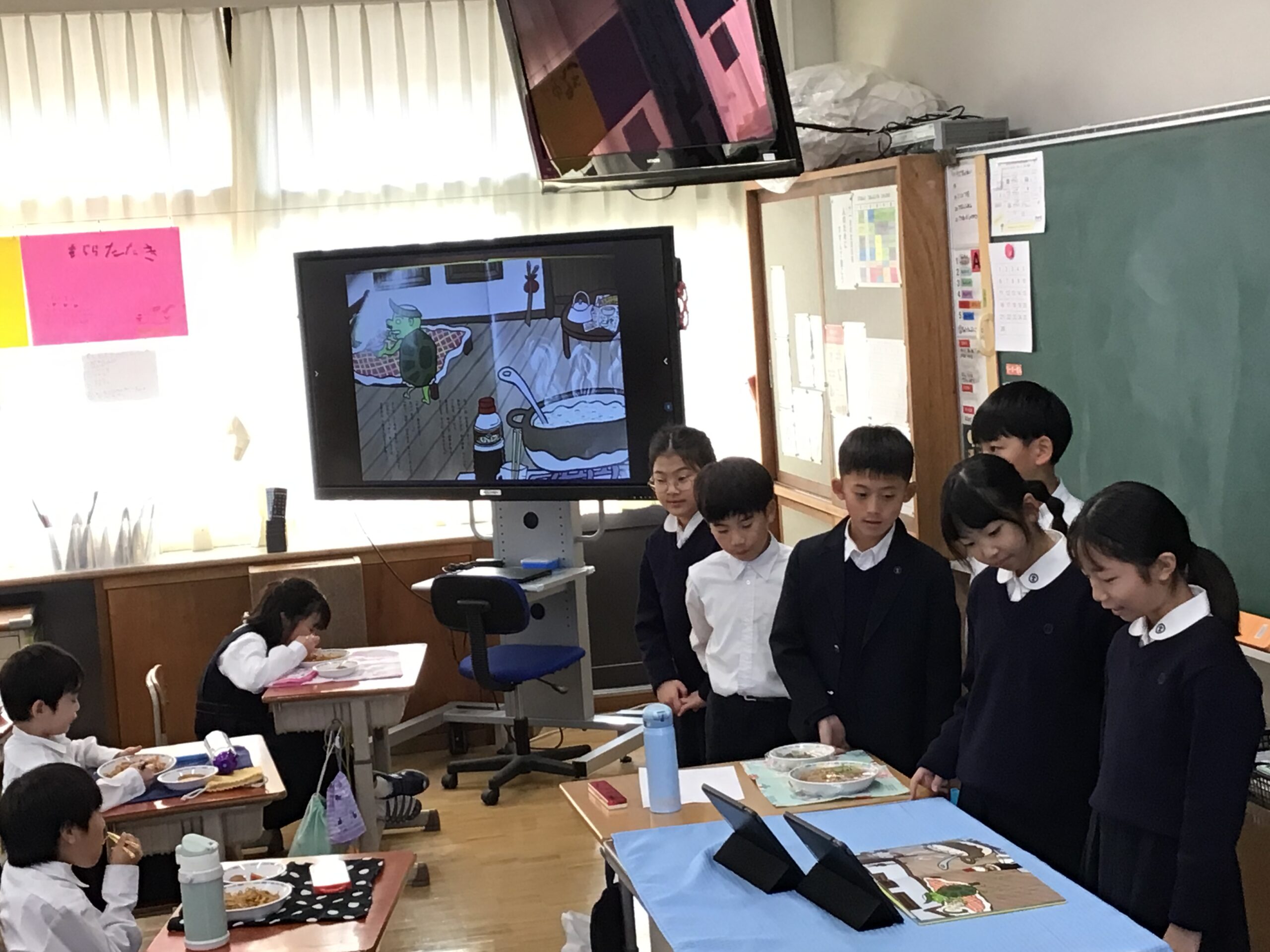 そしていよいよ本番。1年生の5つあるクラスにそれぞれ班に分かれ、お昼ご飯を食べるところにお邪魔して、読み聞かせ会がスタートしました。