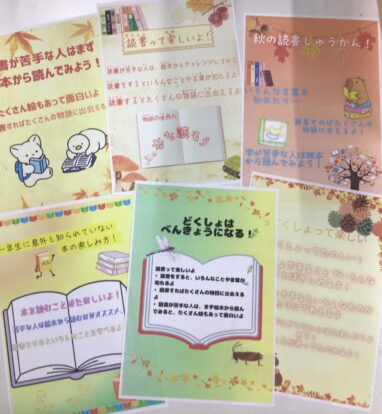また、読書の良さを伝えるポスターも作りました。子どもたちが考えたテーマは「読書って楽しい」です。「読書はたくさんの物語に出会えること」「いろんなことや言葉が知れること」「読むのが苦手な人は絵本から始めてみると、その絵もまた面白い」ということをポスターの中に入れました。