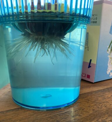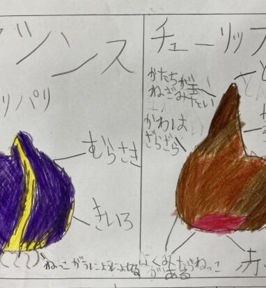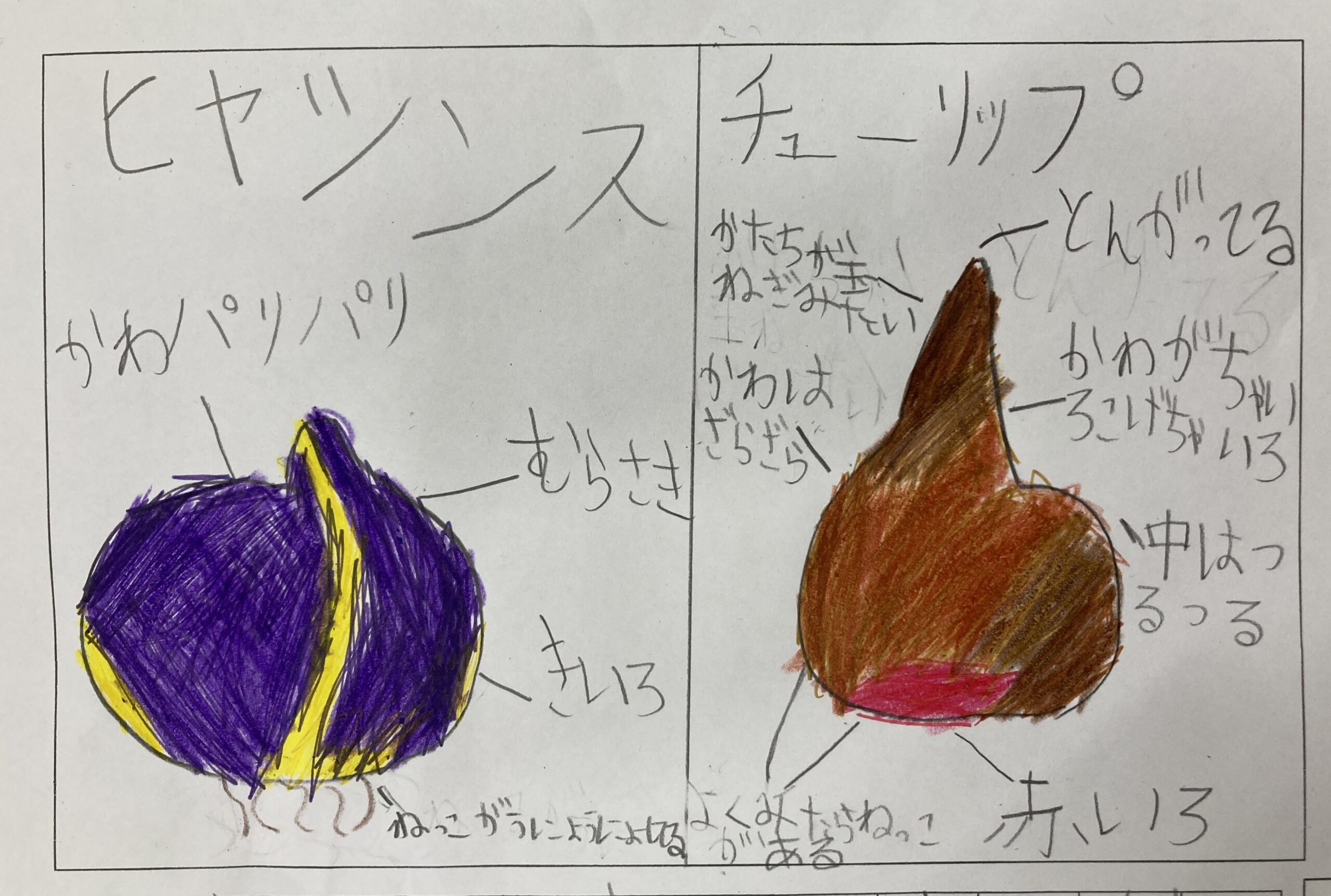 「チューリップの球根は、玉ねぎみたいやなぁ。」「ヒヤシンスの球根の下から、もやしみたいなのが生えてる…。」