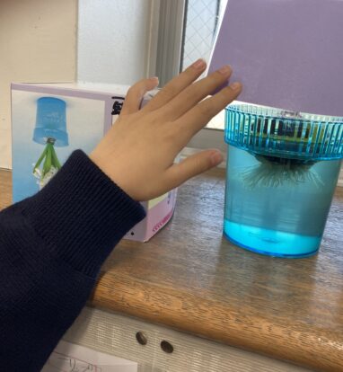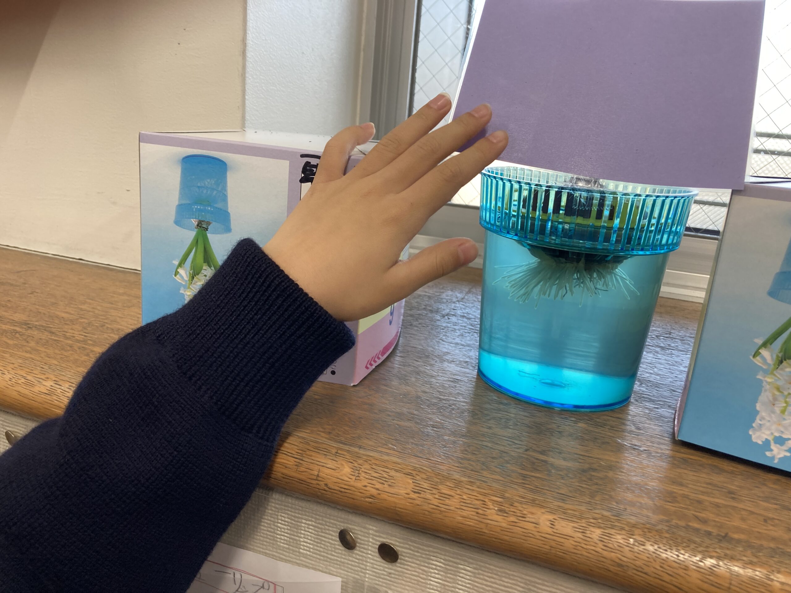 夏に朝顔を育てたプランターではチューリップの球根を、教室ではヒヤシンスの球根を水耕栽培します。