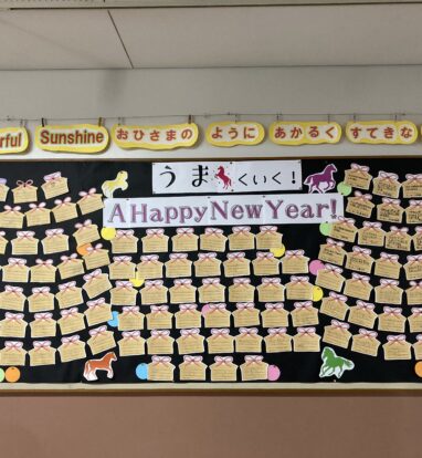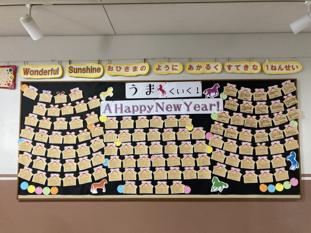 新年になり、始業式から3日目の1年生。学年掲示板には「2026年ウマくいく年にしよう」ということで、上手になりたいことや頑張りたいことを絵馬カードに書いて掲示しました。