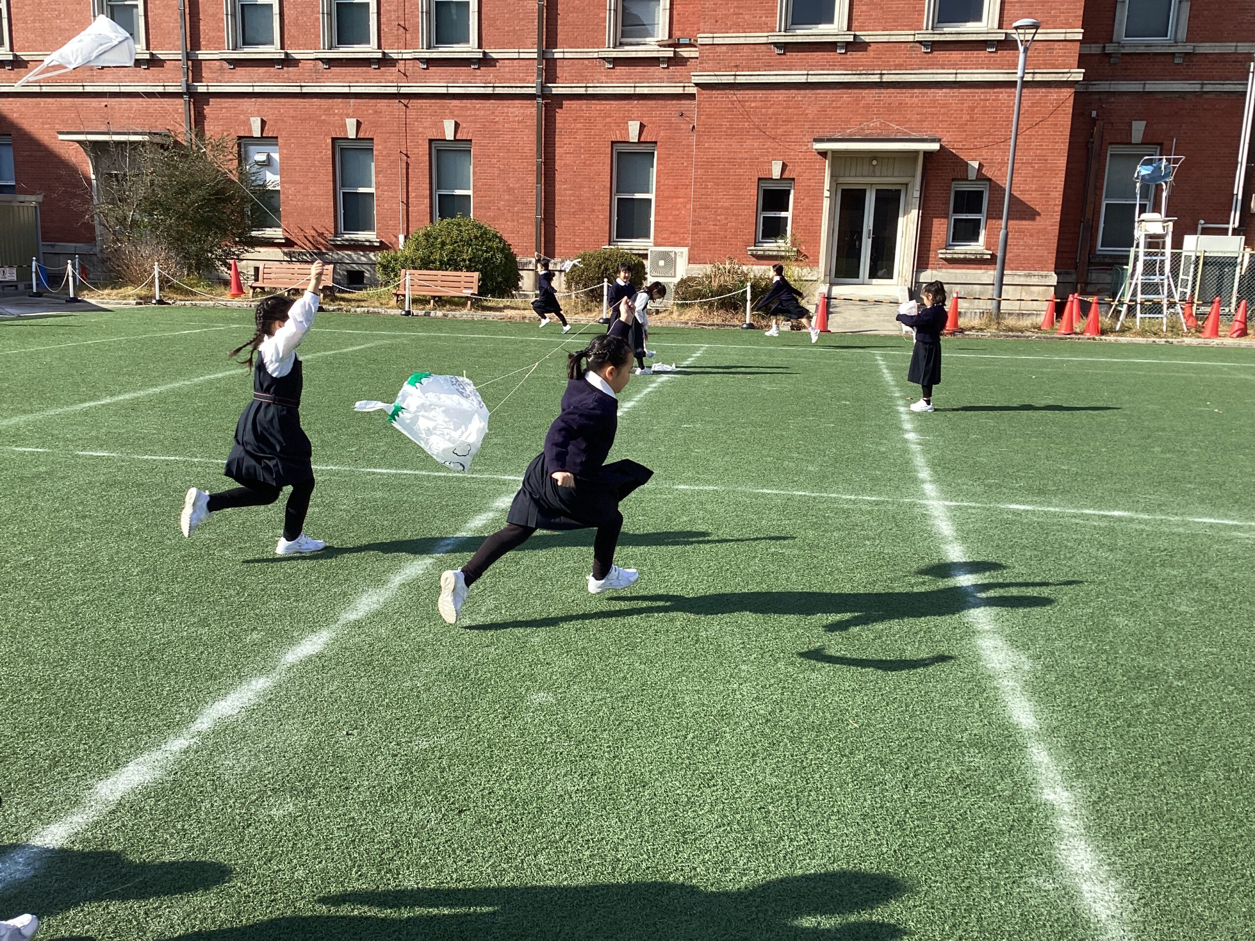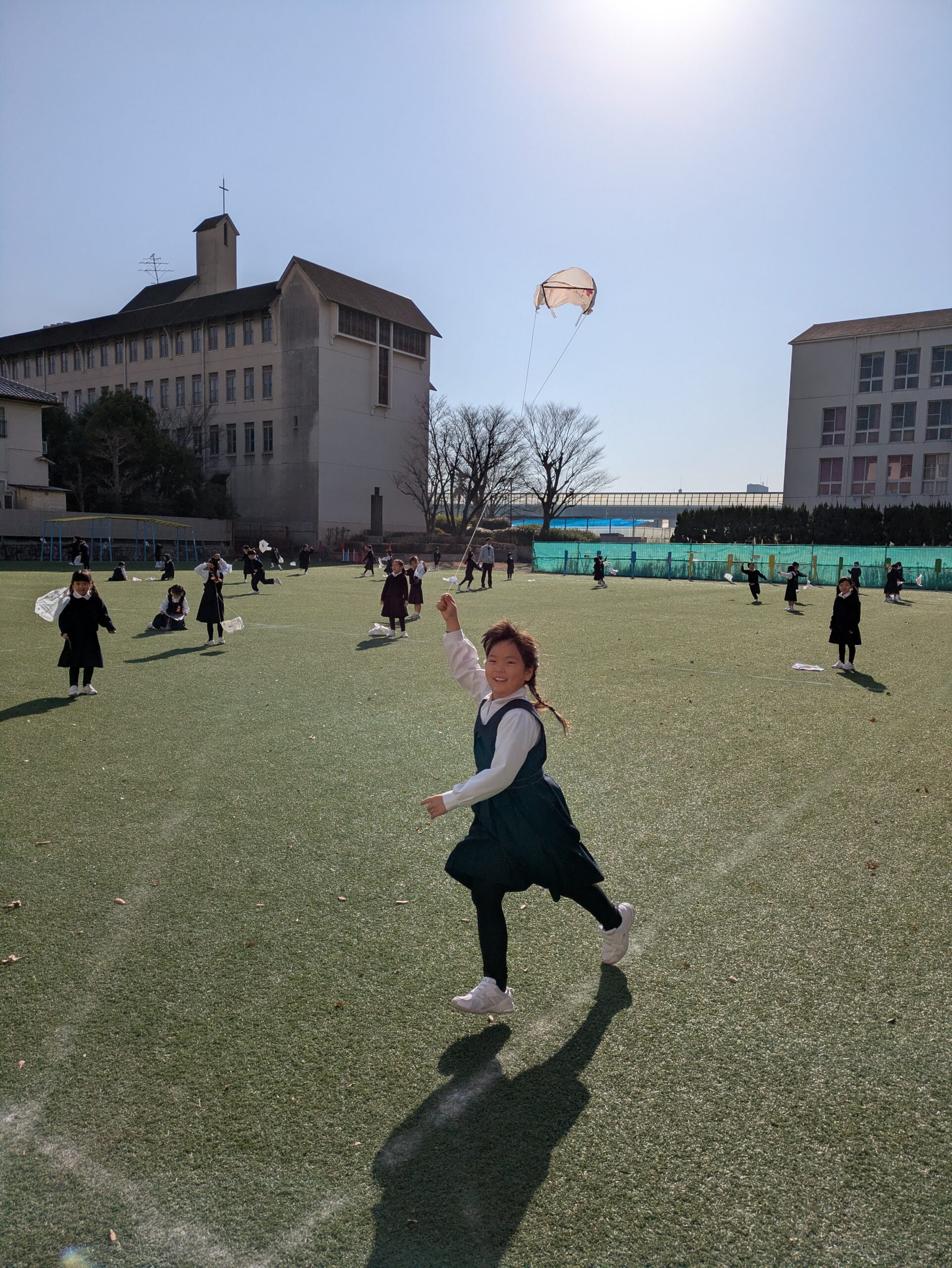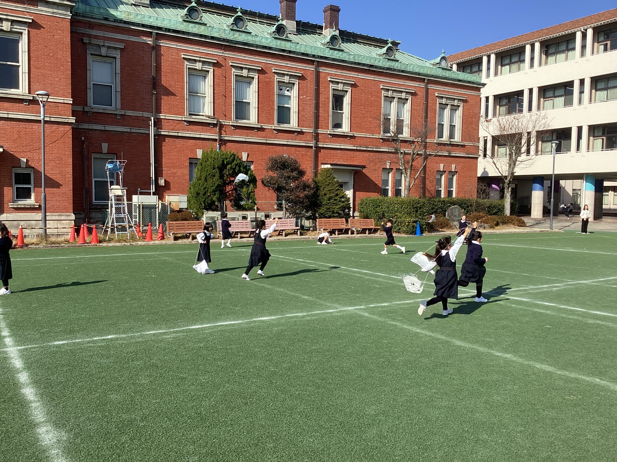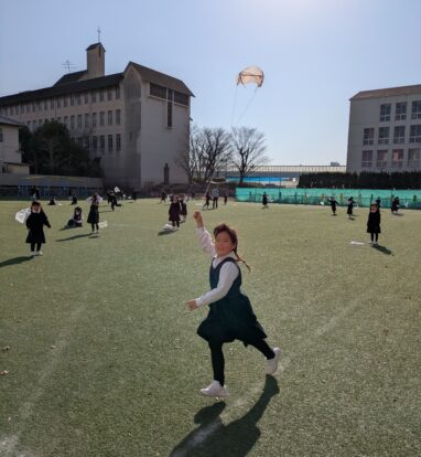 カラフルでかわいい凧が青空にたくさん浮かび、中運動場が素敵な姿になりました。