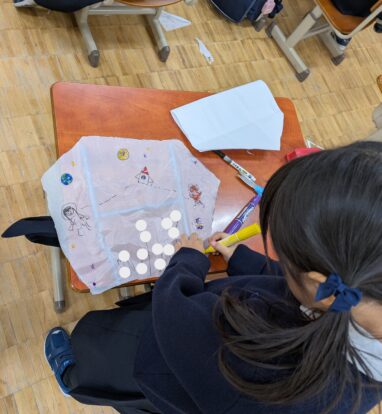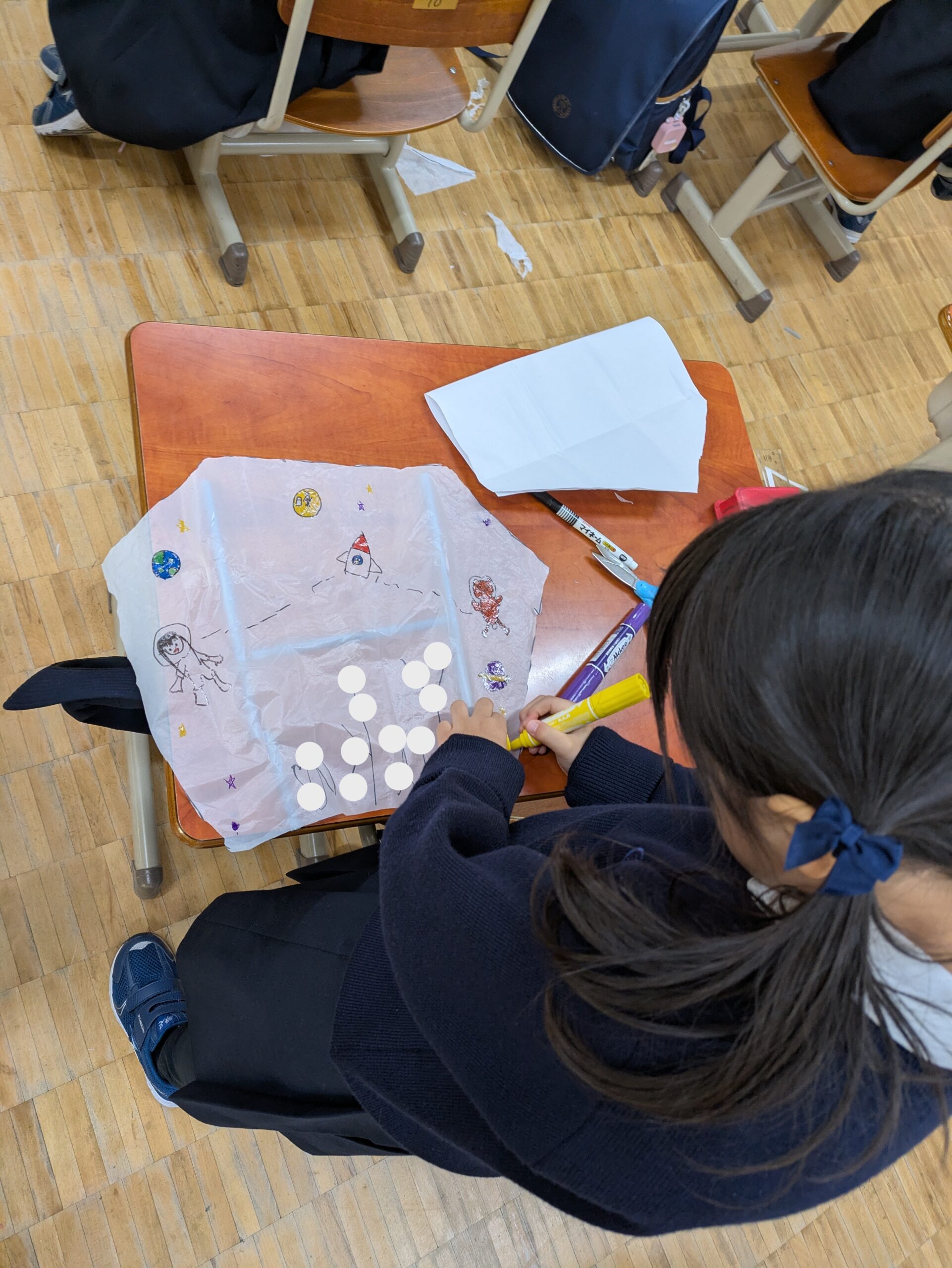 ビニール袋にストローの骨を貼り付けて、たこ糸を取り付けたら、最後は自分だけの凧にするためのスペシャルな絵を描いて仕上げです。