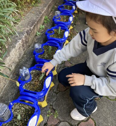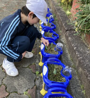 チューリップの生長をとても喜んでいる子どもたちです。そんな子どもたちは、6年生のお兄さんお姉さんを送る会で素敵なプレゼントを披露しました。