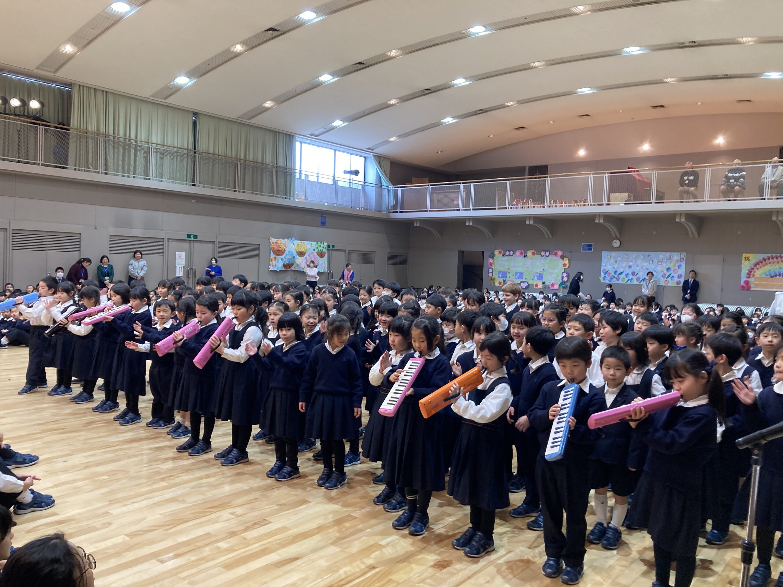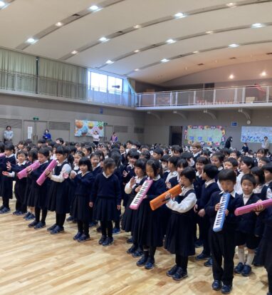 「きらきら星」のピアニカ演奏に合わせたボディパーカッションでは、1年生らしい元気な姿をお届け。「今日も明日も1年生」の替え歌では、声を合わせてしっとりと歌い上げました。