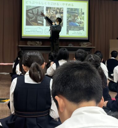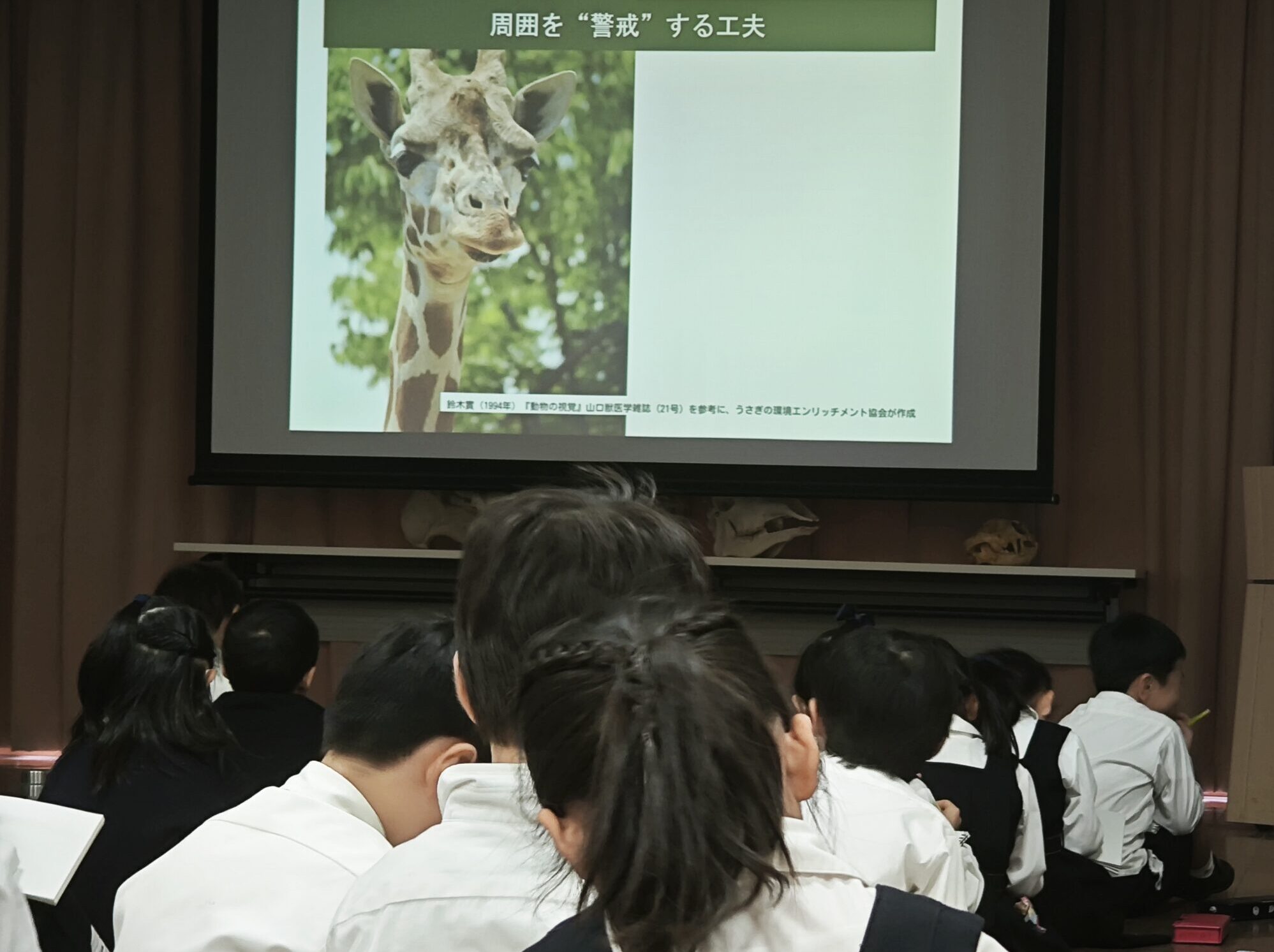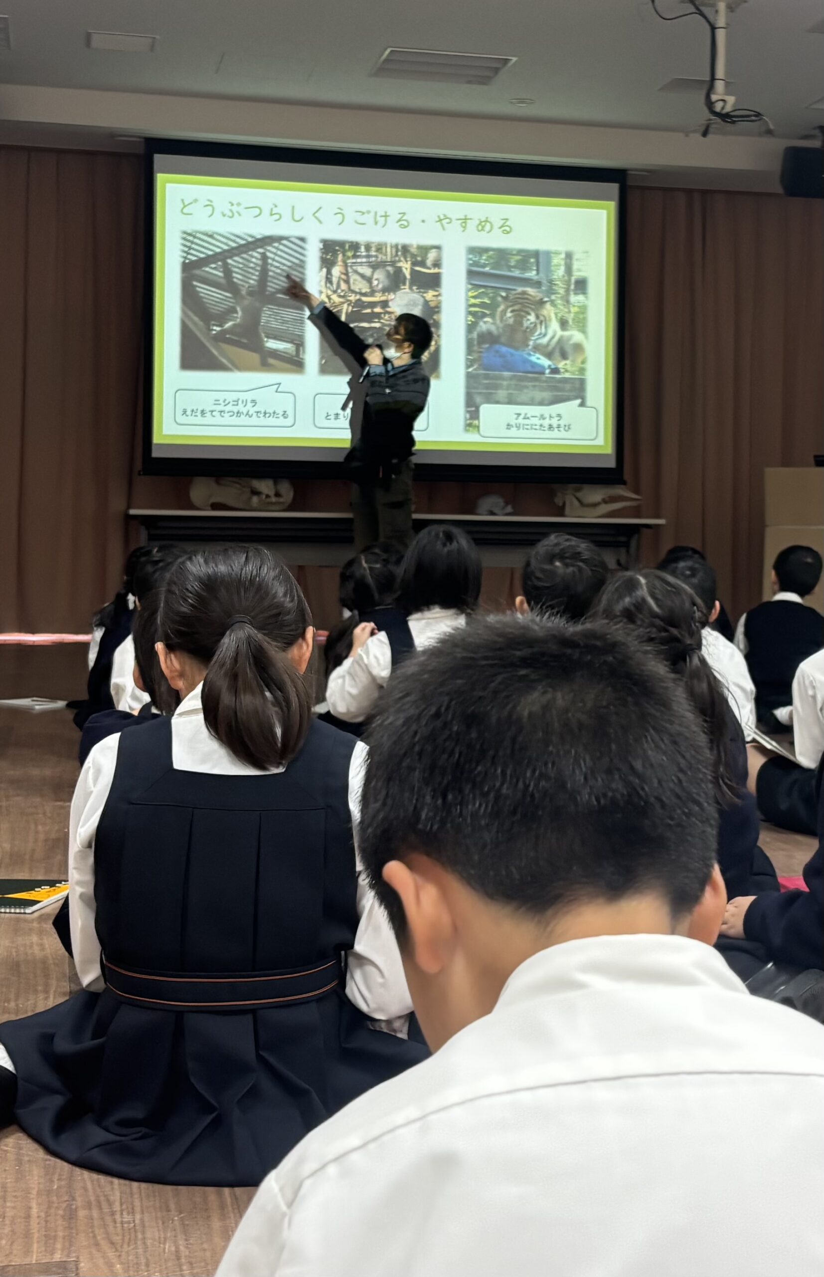 後半の「動物福祉」では、飼育および展示における“個々の動物の身体的・心理的状態”についてのお話を伺いました。動物の表情だけでなく、心拍数、行動、群れの動き、声など様々な情報から、その動物が安心しているのか不安なのかを読み取っていることを教えていただきました。子どもたちも、動物の状態に気づく視点をこれからの探究で深めていきます。
