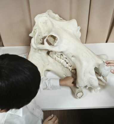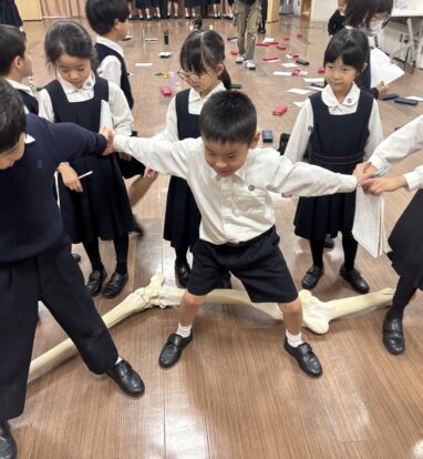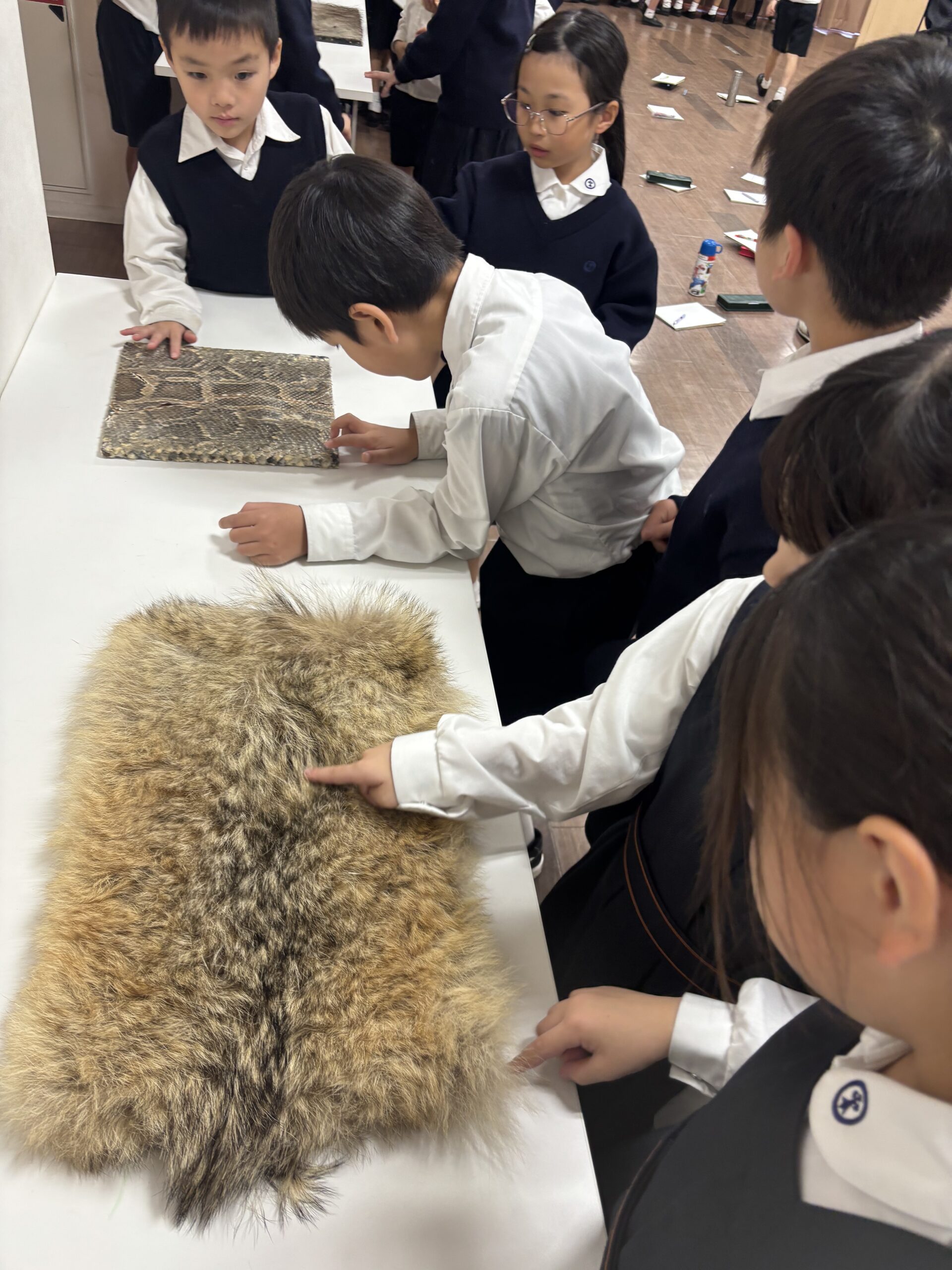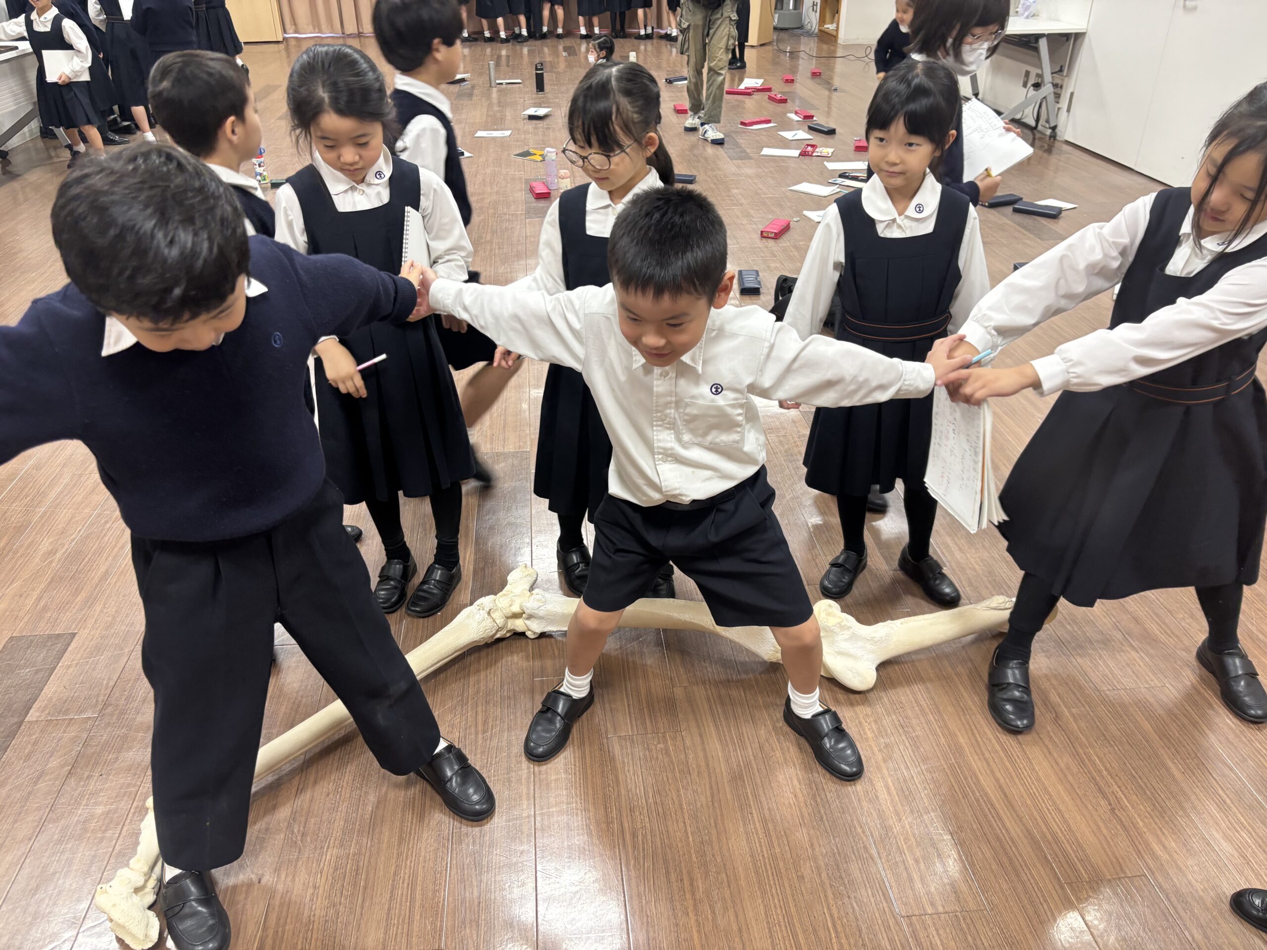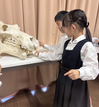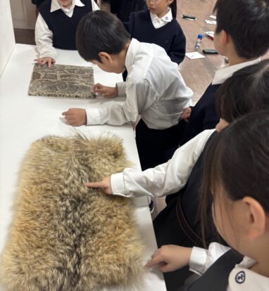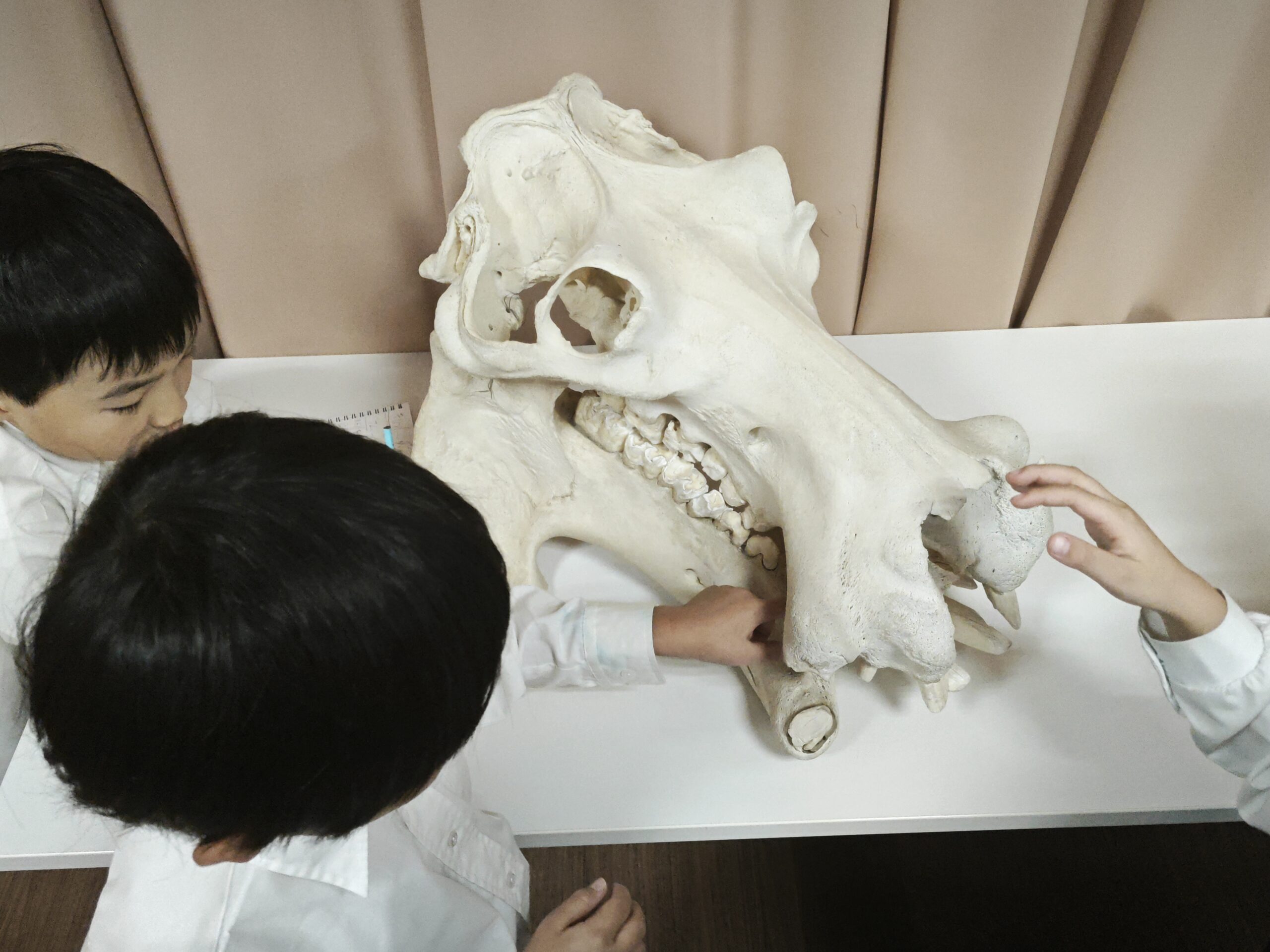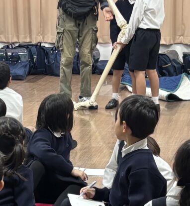 「動物の体のつくり」では、実際の標本を用いて、体の特徴や骨格の秘密について詳しく教えていただきました。本物の骨格標本を間近に見た子どもたちは興味津々。触れてよい時間には、指先でそっとなぞりながら「こんなにかたいんだ!」「思ったよりふさふさしてる!」と、驚きと発見の声がたくさん上がっていました。