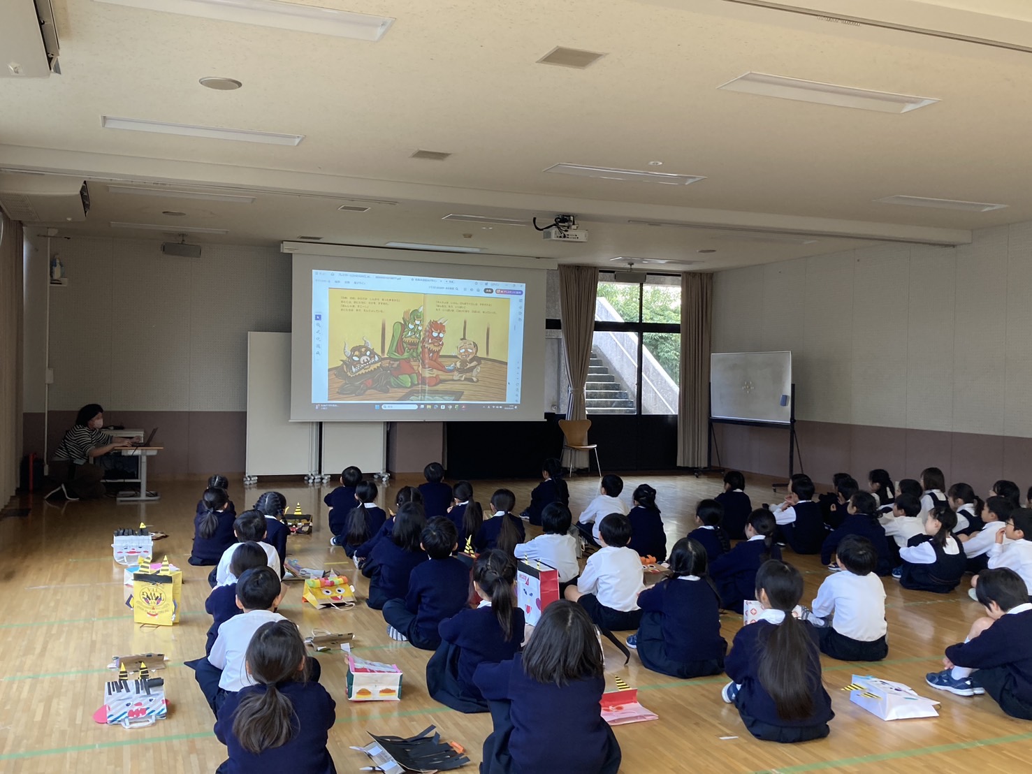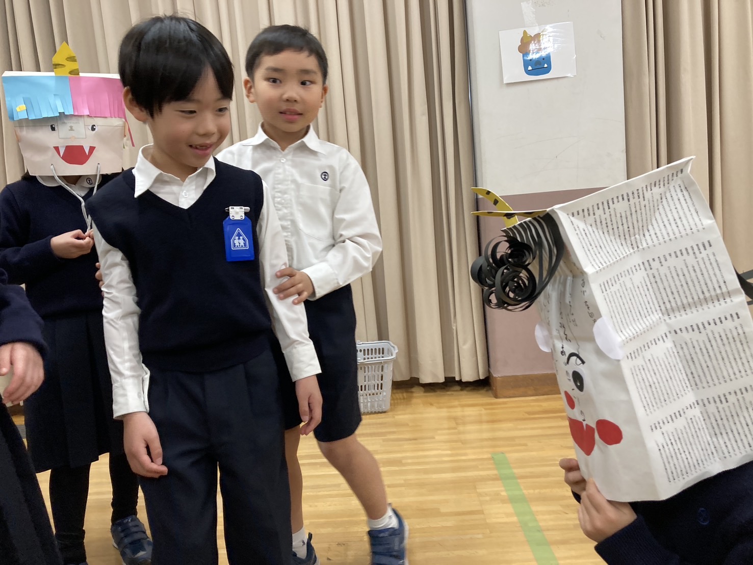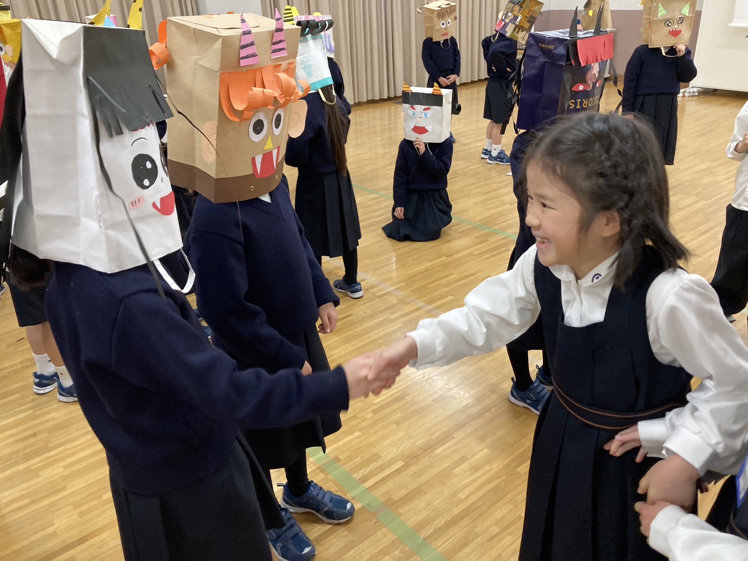 1年生との集会では、節分に関するクイズを一緒に考え、先生による節分のお話の読み聞かせを楽しみました。2年生が作ったおにのお面に、1年生は興味津々です。来年作りたいなあ、という声も聞こえてきました。