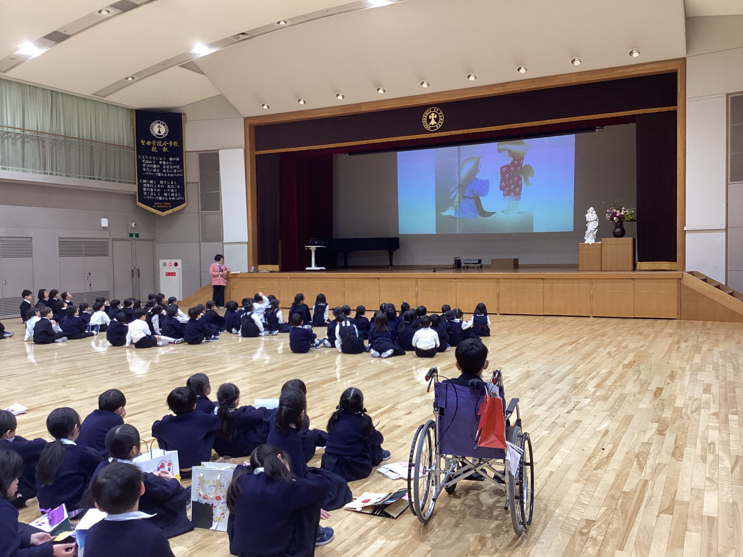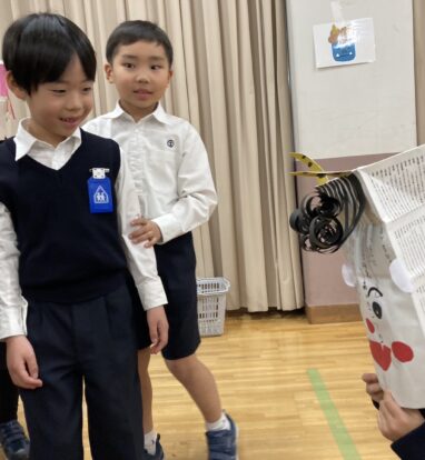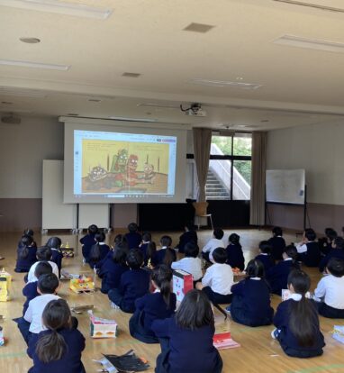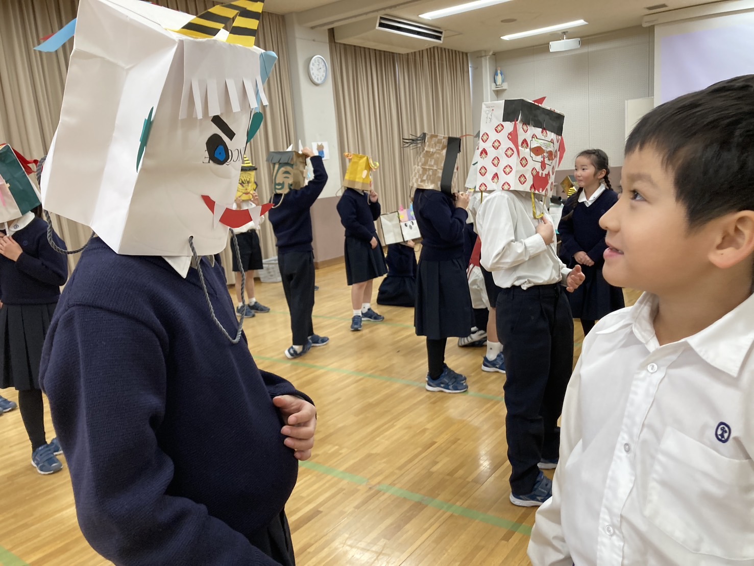 1年生との集会では、節分に関するクイズを一緒に考え、先生による節分のお話の読み聞かせを楽しみました。2年生が作ったおにのお面に、1年生は興味津々です。来年作りたいなあ、という声も聞こえてきました。