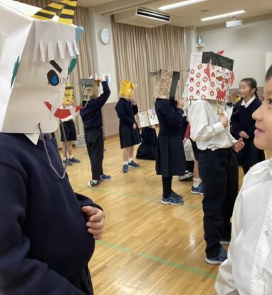2年生にも、そうした「心のおに」を、これから追い出すために何ができるか考えてきました。図工の時間には、紙袋でつくったおにのお面を製作し、今日の豆まき集会でお披露目しました。