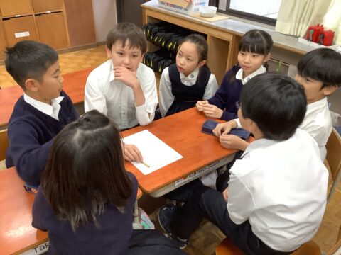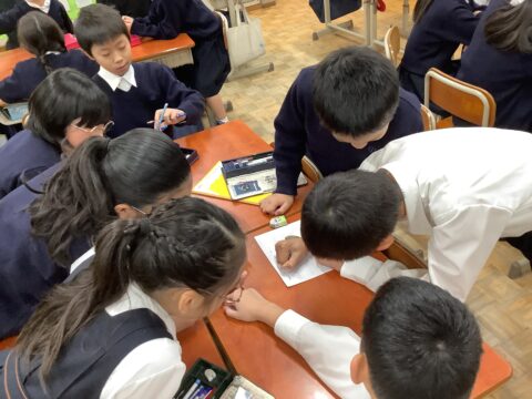 4グループに分かれて、韓国の小学校との交流のクイズバトルのために、クイズ作りを行っています。