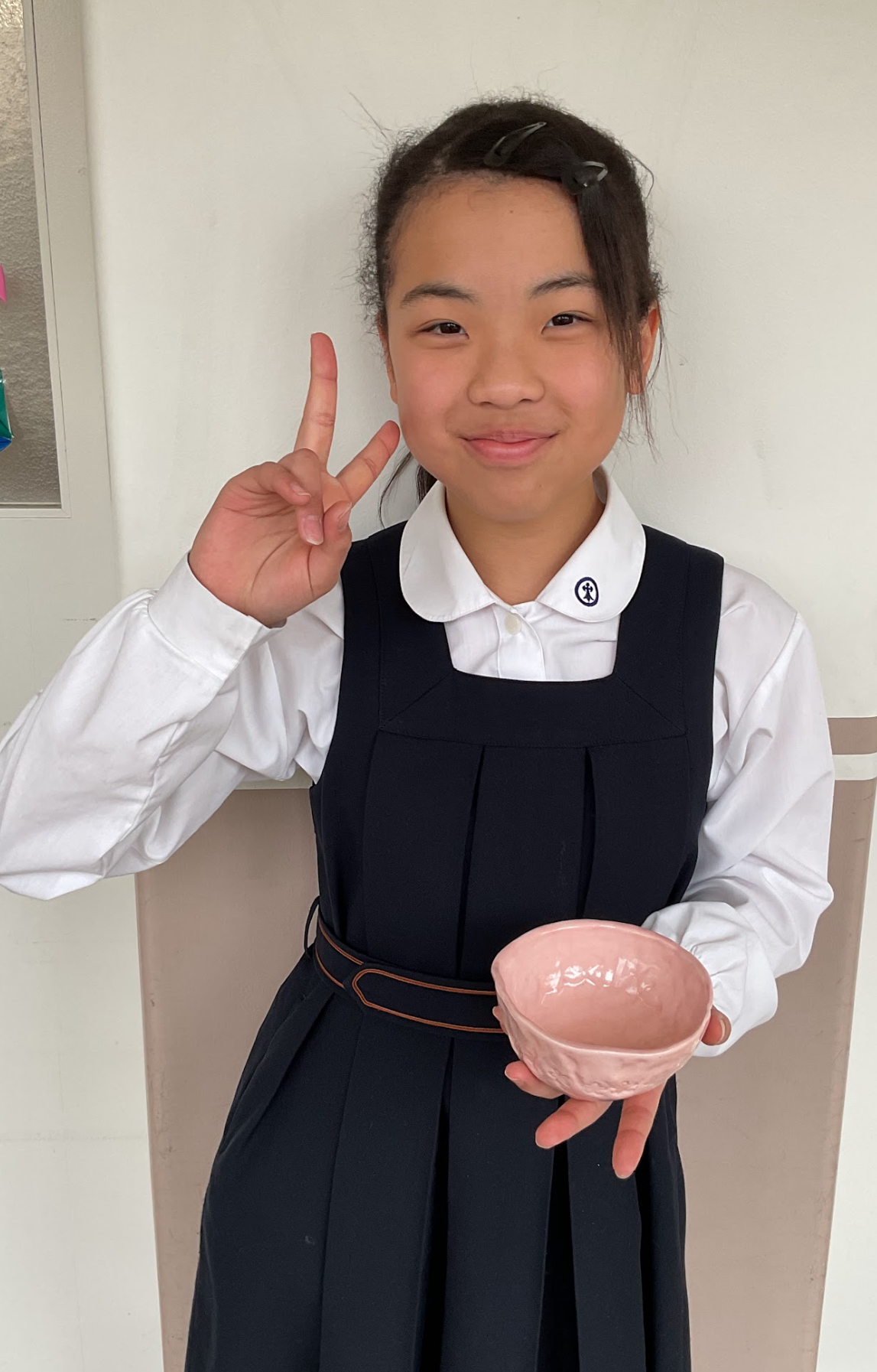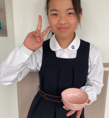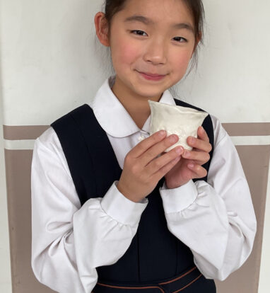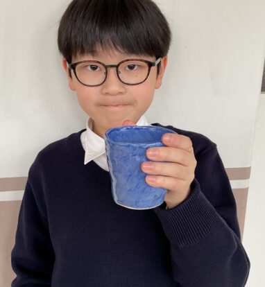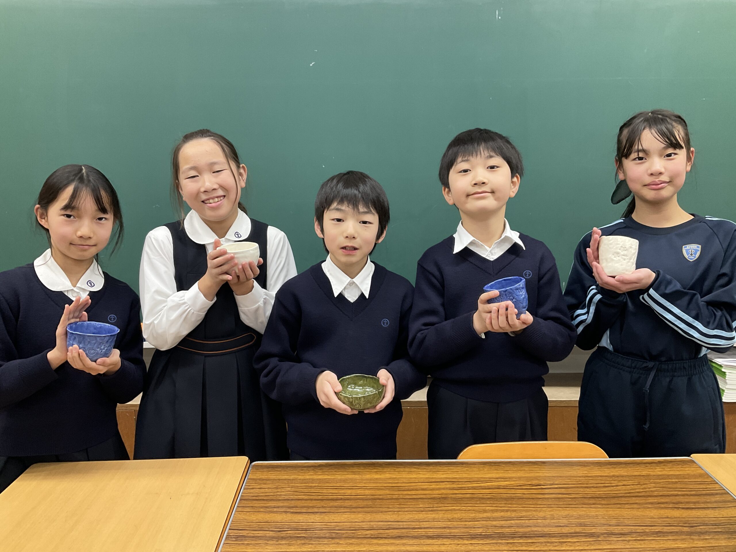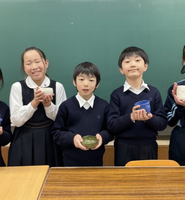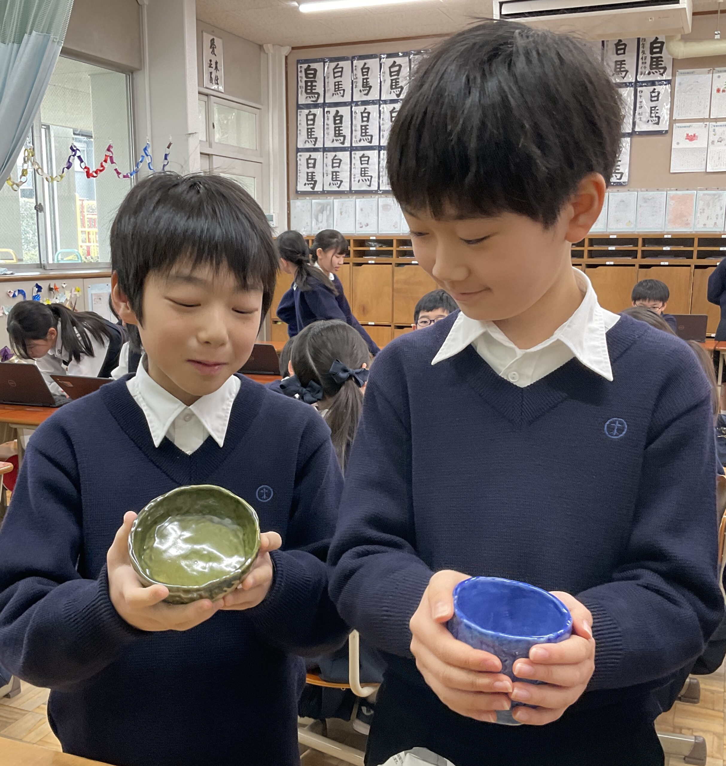 心待ちにしていた子どもたちは、わくわくが止まりません。世界に一つだけの湯飲み茶わん。手に取った瞬間、「きれい!」「頑張ってよかった!」と教室いっぱいに笑顔が広がりました。「その色もいいね!」「大人っぽくてすてき!」と、お友達同士で声をかけ合う姿もあり、とても微笑ましいひとときとなりました。