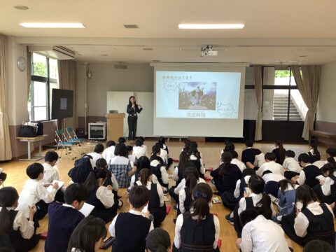 授業では、歌舞伎の成り立ちや、役者さんの化粧についてなど、歌舞伎について様々なお話を聞くことができ、子ども達は熱心にメモをとりながら話に聞き入る様子がみられました。