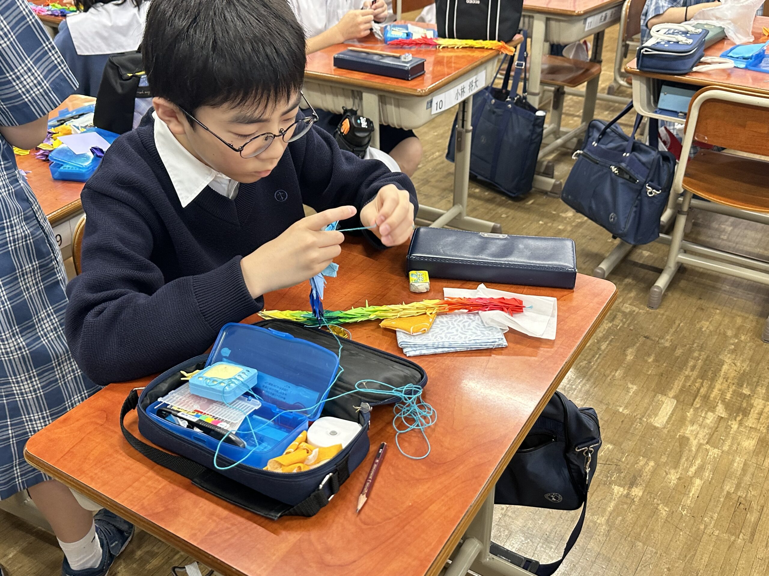 子どもたちは、貞子さんが願いをこめて折り続けていた折り鶴を、休み時間で鶴を折り、そして千羽鶴を完成させました。