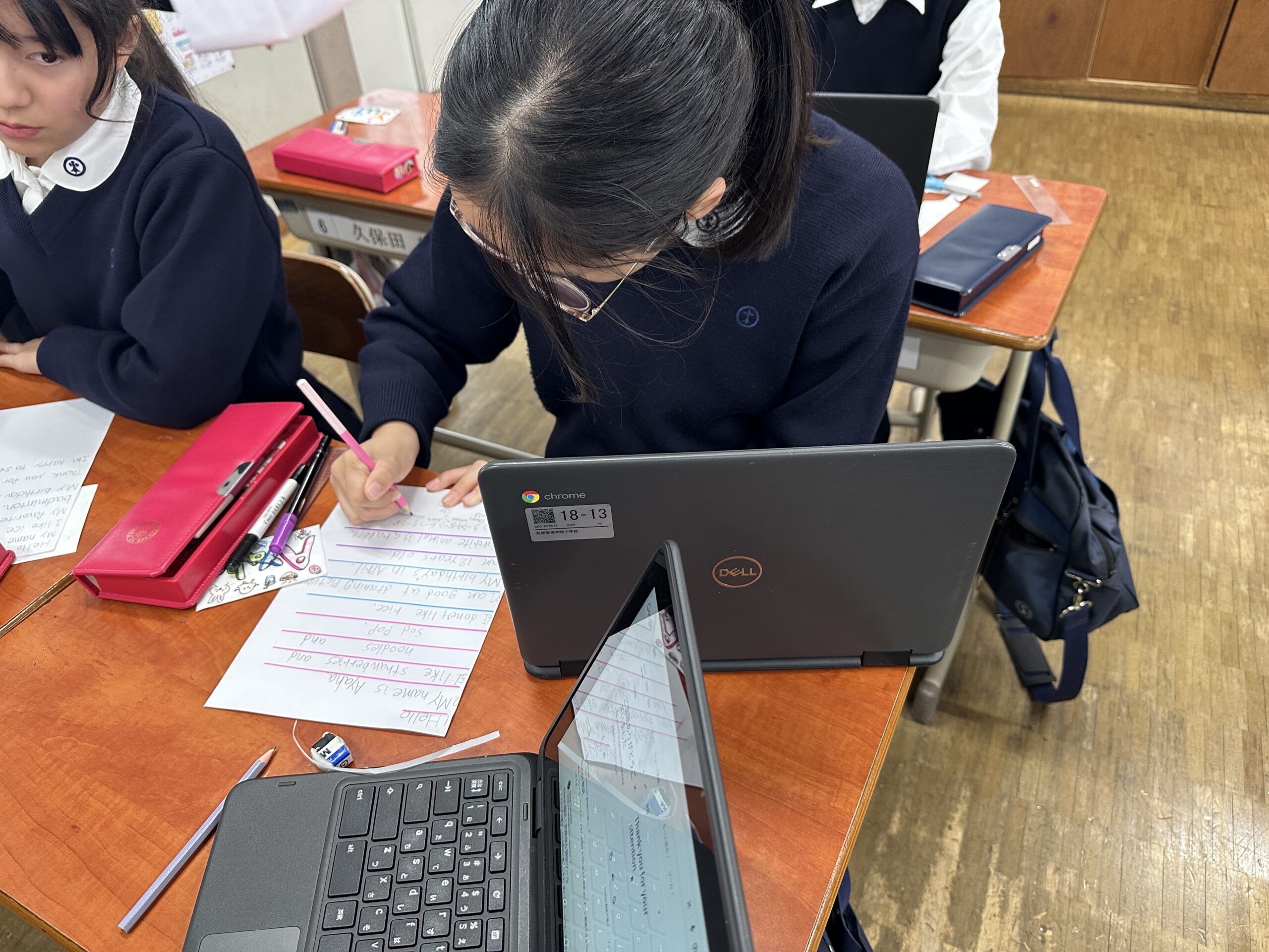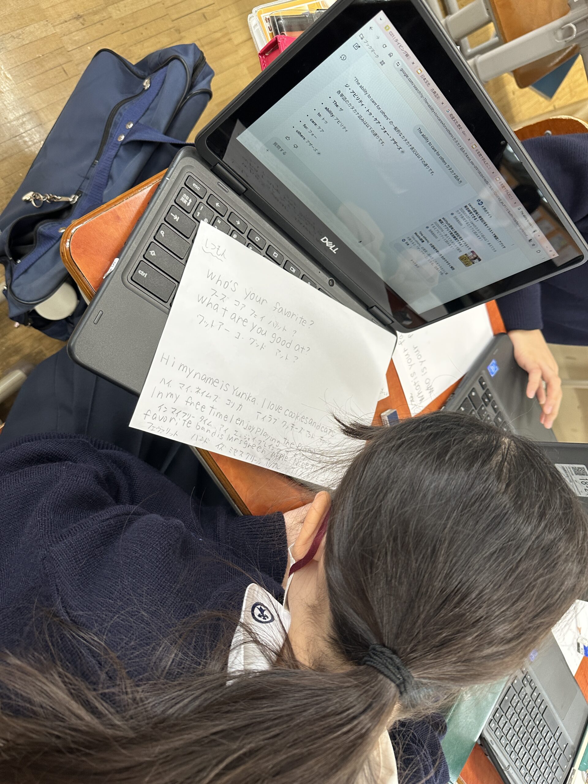 それまでに、子どもたちはたくさん準備をしました。自分の名前を知ってもらうために、英語で名札を作ったり、自己紹介を英文で考えたり、質問を考えたりしました。