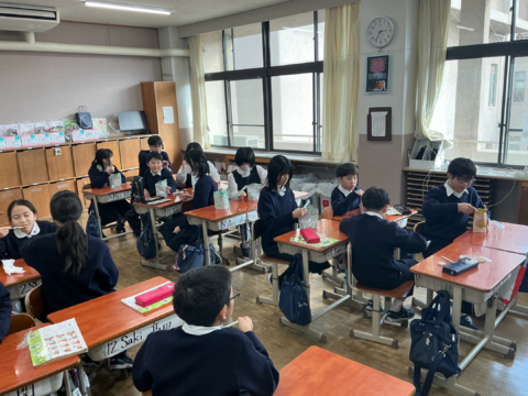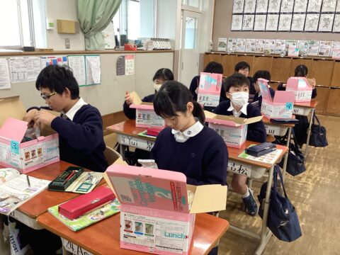箱の中には五目御飯やリゾットなど異なる味のご飯が6食分・クッキー・水が入っていました。その中から1つ選んで試食しました。今回は湯煎をしてから食べましたが、実際に災害が起こったときは、冷たいまま食べなければならないかもしれません。「思ったよりおいしい」「何もせずに食べられて便利」「カロリーが高い」など色々な感想が出ました。これらの食事が「命を繋ぐ」ということについて学ぶよい機会となりました。