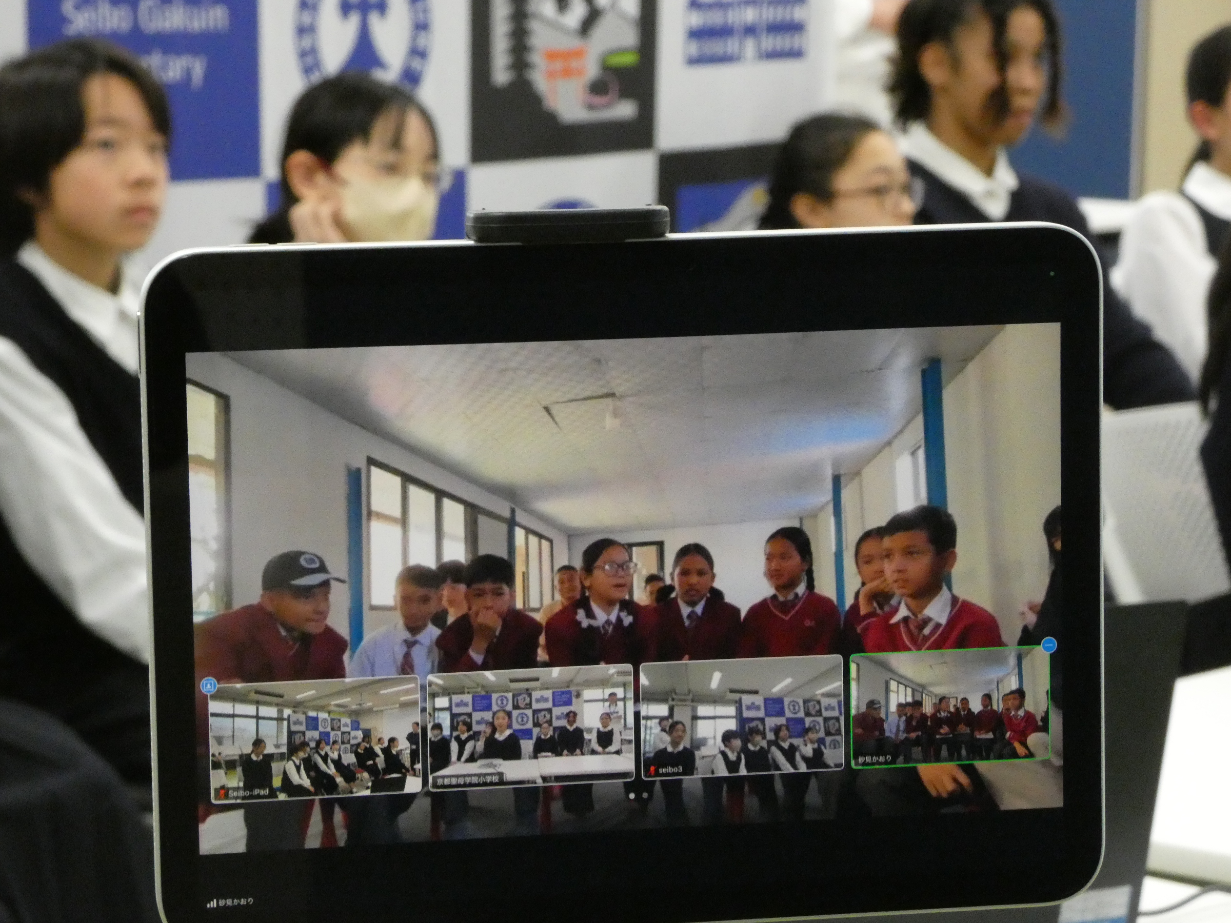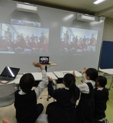 交流の中で、両方の児童が驚いたことがあります。それは、聖母側の児童が「カレーライスは好きですか?」と質問したことに始まります。ネパール側の児童は、「カレーライス」が何かわからず、ざわざわなりました。聖母側は「カレーライス」が分からない様子に「えっ?」となっています。そこで、ネパール人のコーディネーターさんが「実は、カレーライスは日本で生まれた料理ですよ。ネパールにはありません。」と教えてくれました。実際に話してみたからわかったというおもしろい話です。