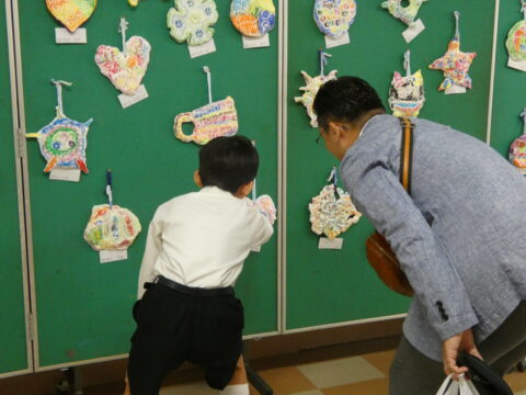 一人で1組の来場者を担当し、図工作品や最近出かけた校外学習のこと、学校行事のことなどを紹介しながら、会場まで案内しました。