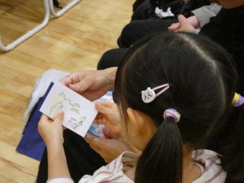 説明会前半は、園児さん、保護者の方ご一緒に、合唱団の歌声、バトンの演技、おみやげのカードの説明をきいていただき、その後、園児さんは5年生のおにいさん、おねえさんとが待つ教室へ。