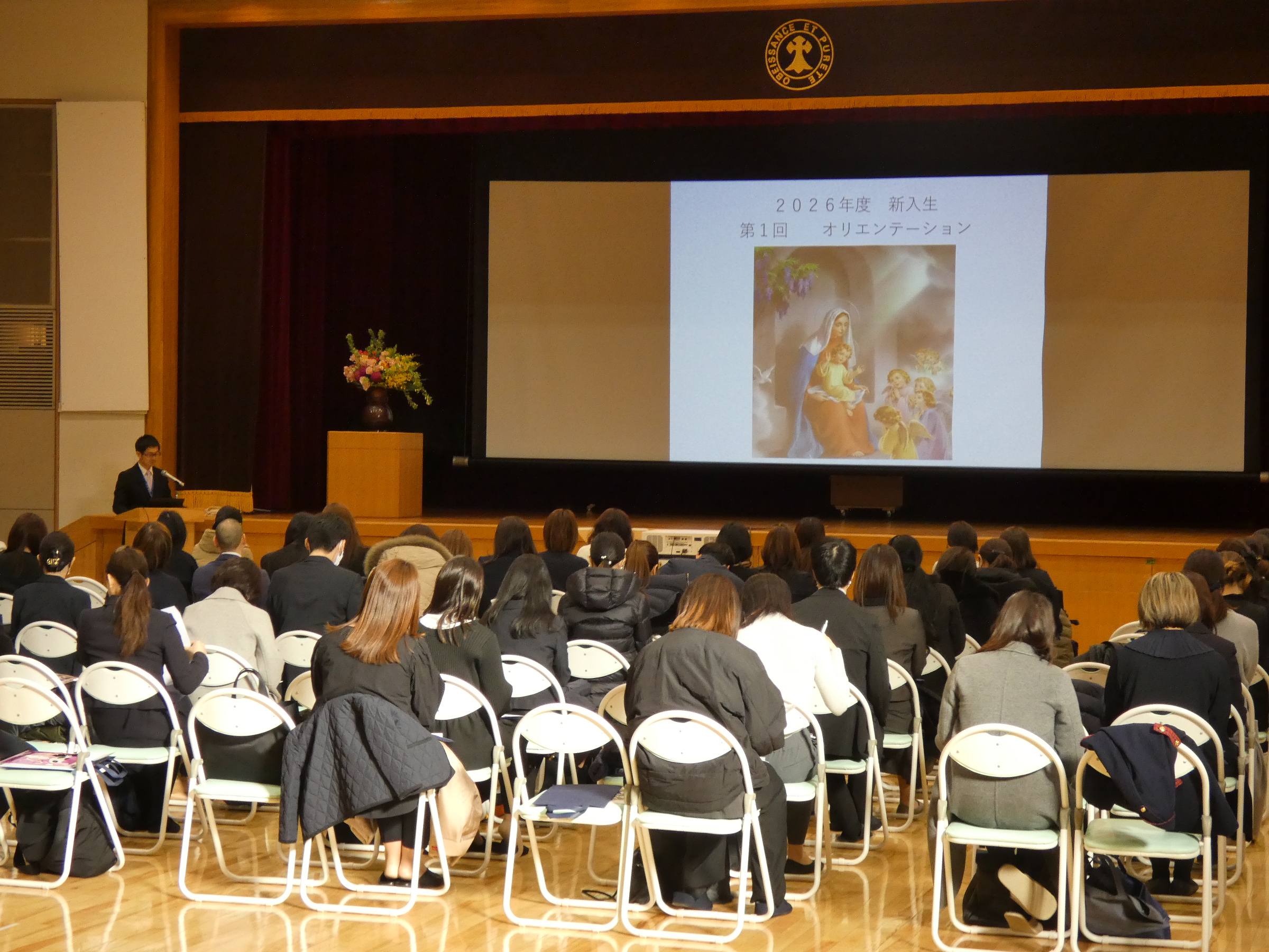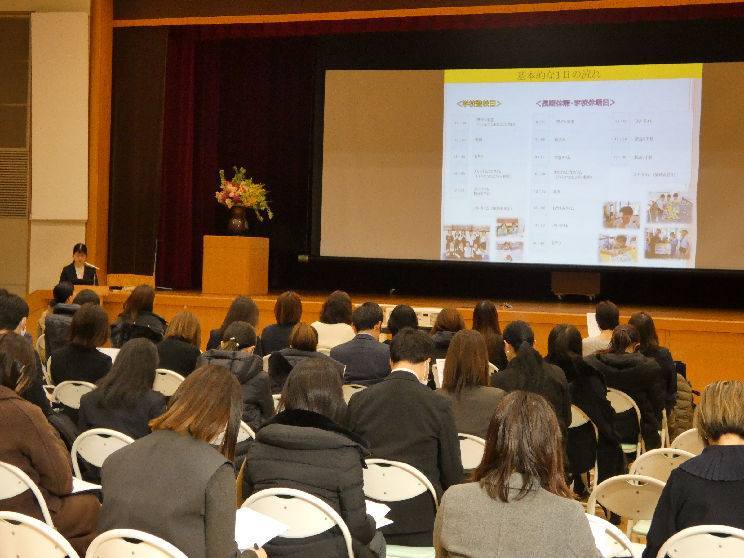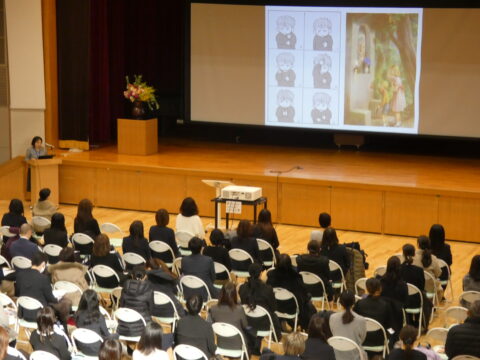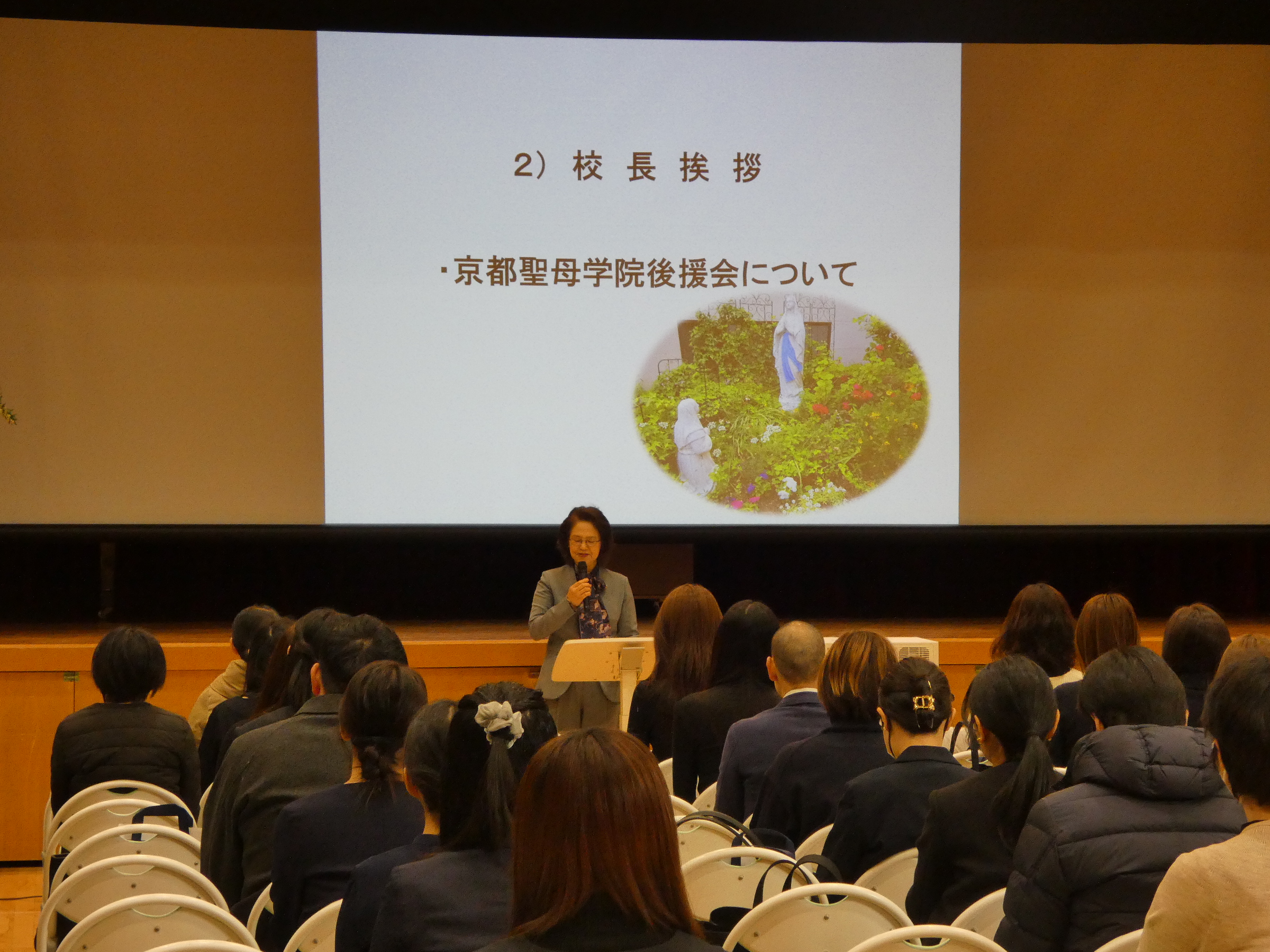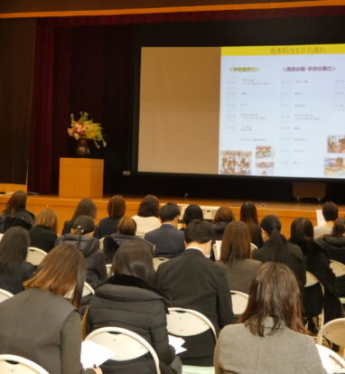 講堂では保護者のみなさまへ、お子さまが安心して学校生活をスタートできるよう、入学準備のご案内をさせていただきました。
