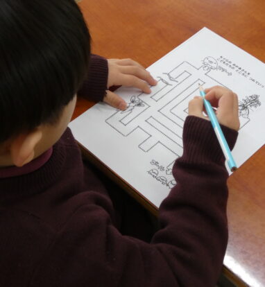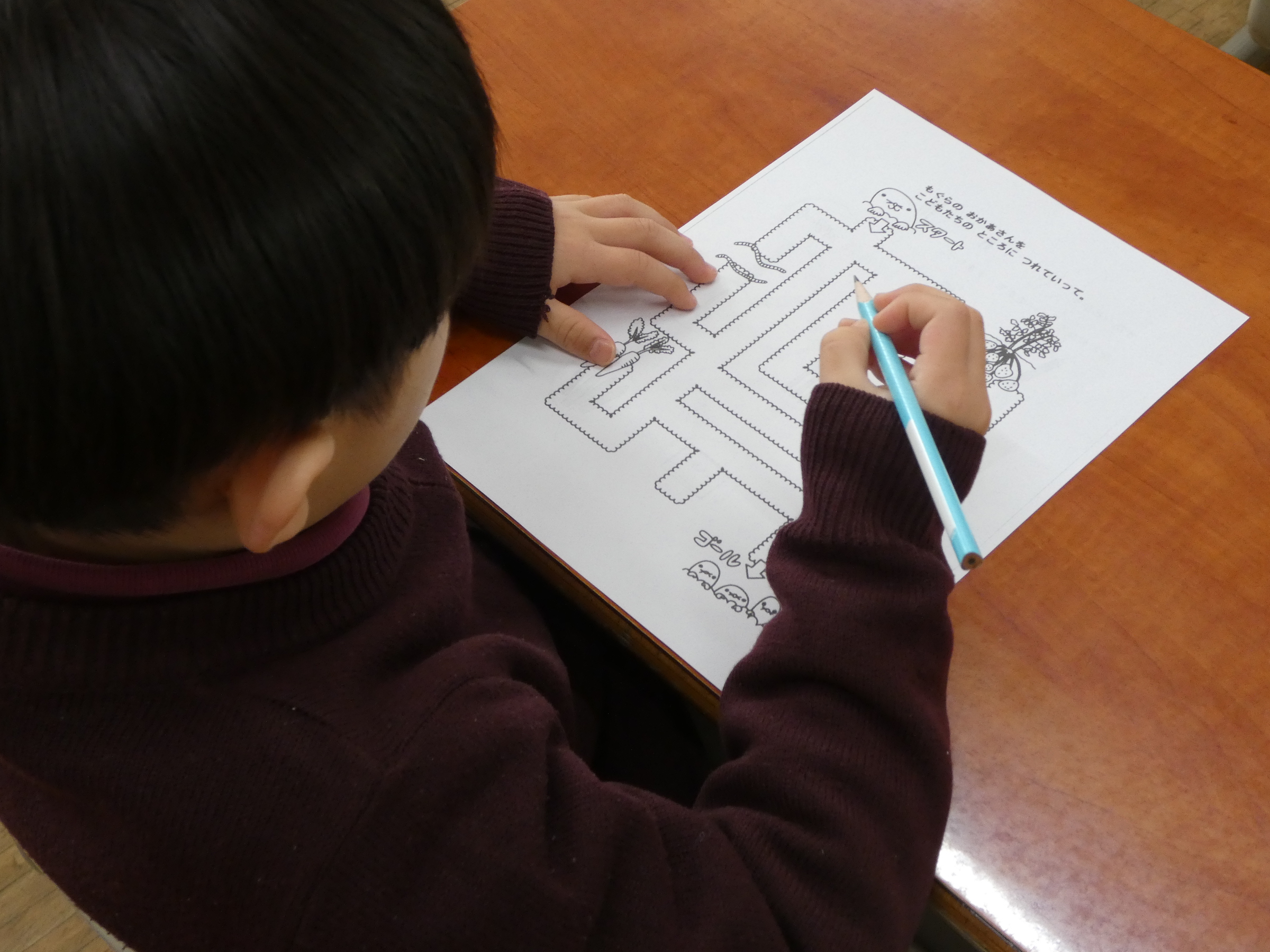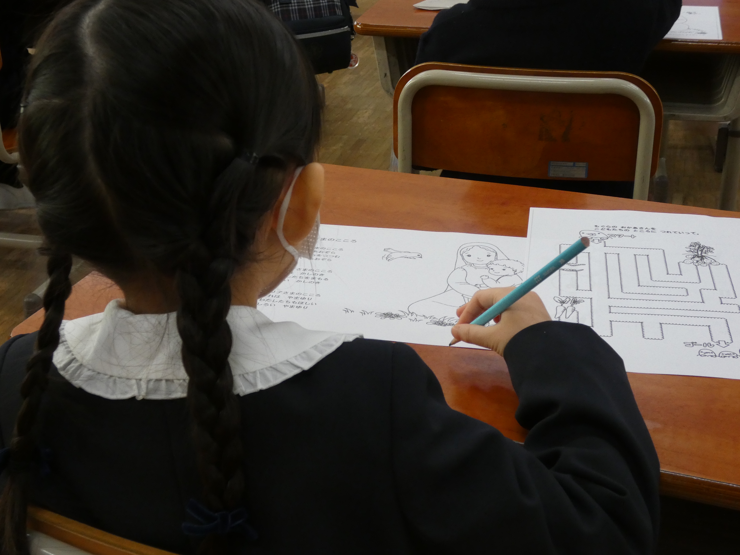 少し緊張した面持ちで、保護者の方と離れて教室で始まりを待つ子どもたち。 教室では、先生のお話を熱心に聞きながら、お祈りを教わったり、鉛筆を正しく丁寧に持ってみたり。その姿は、すでに立派な「1年生」への第一歩を、力強く踏み出しているようでした。