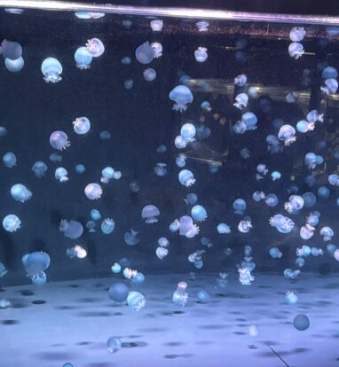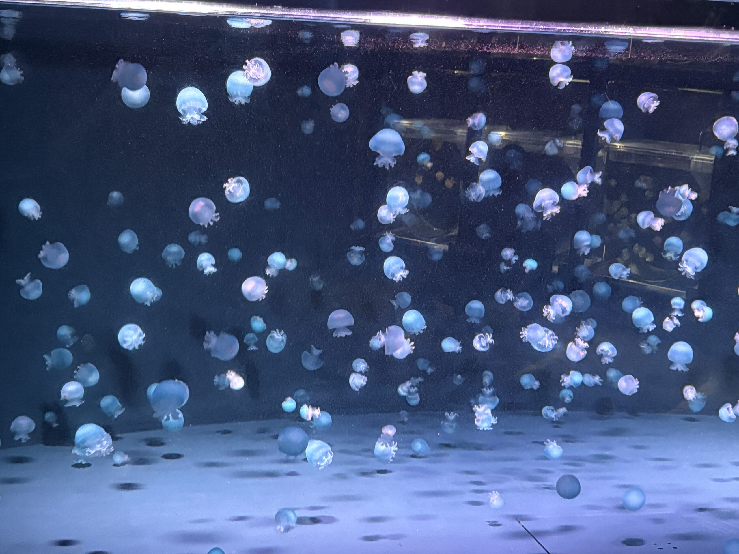 の食事、オオサンショウウオの大きさ、クラゲの優美な世界には、見入っている人が