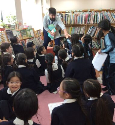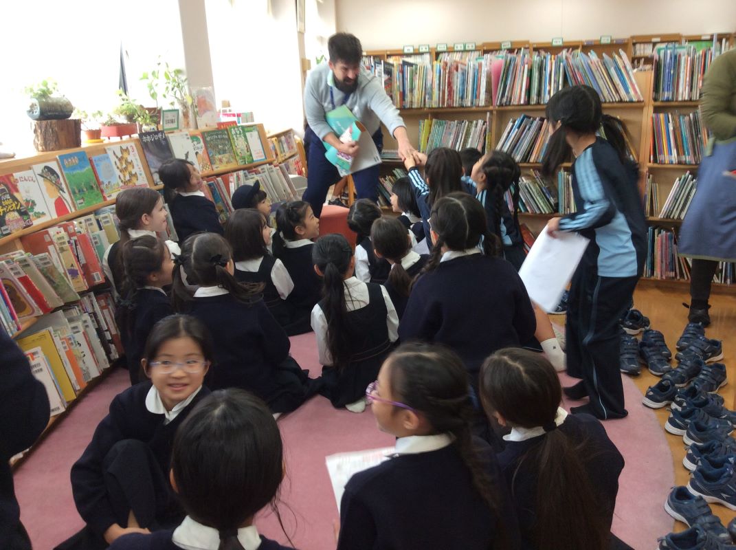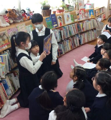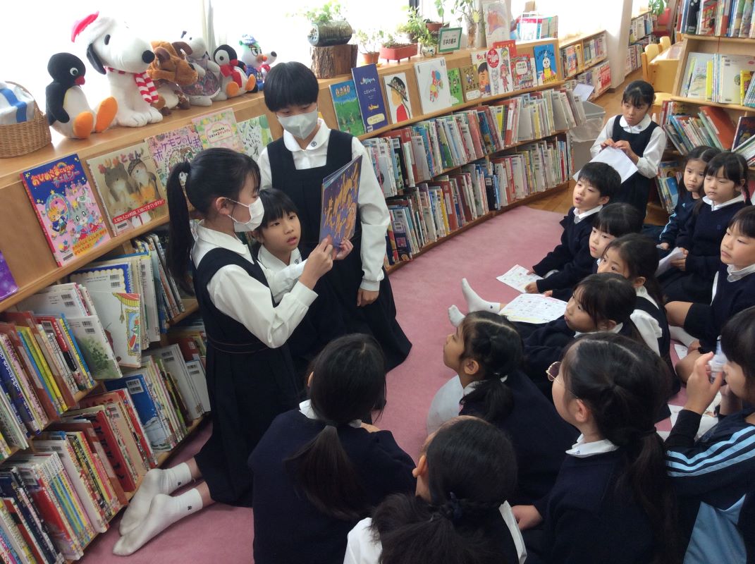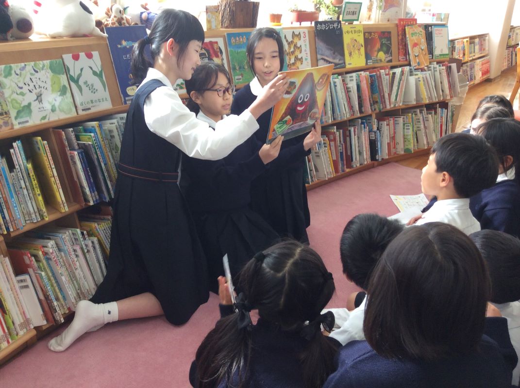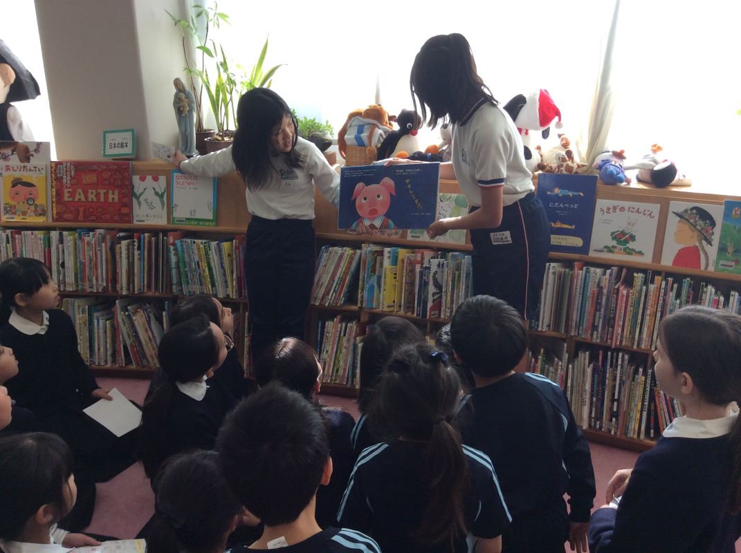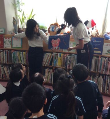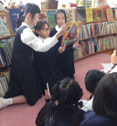 図書委員さんによるよみきかせや、イングリッシュチャットでポールマン先生の英語の絵本の読み聞かせなど