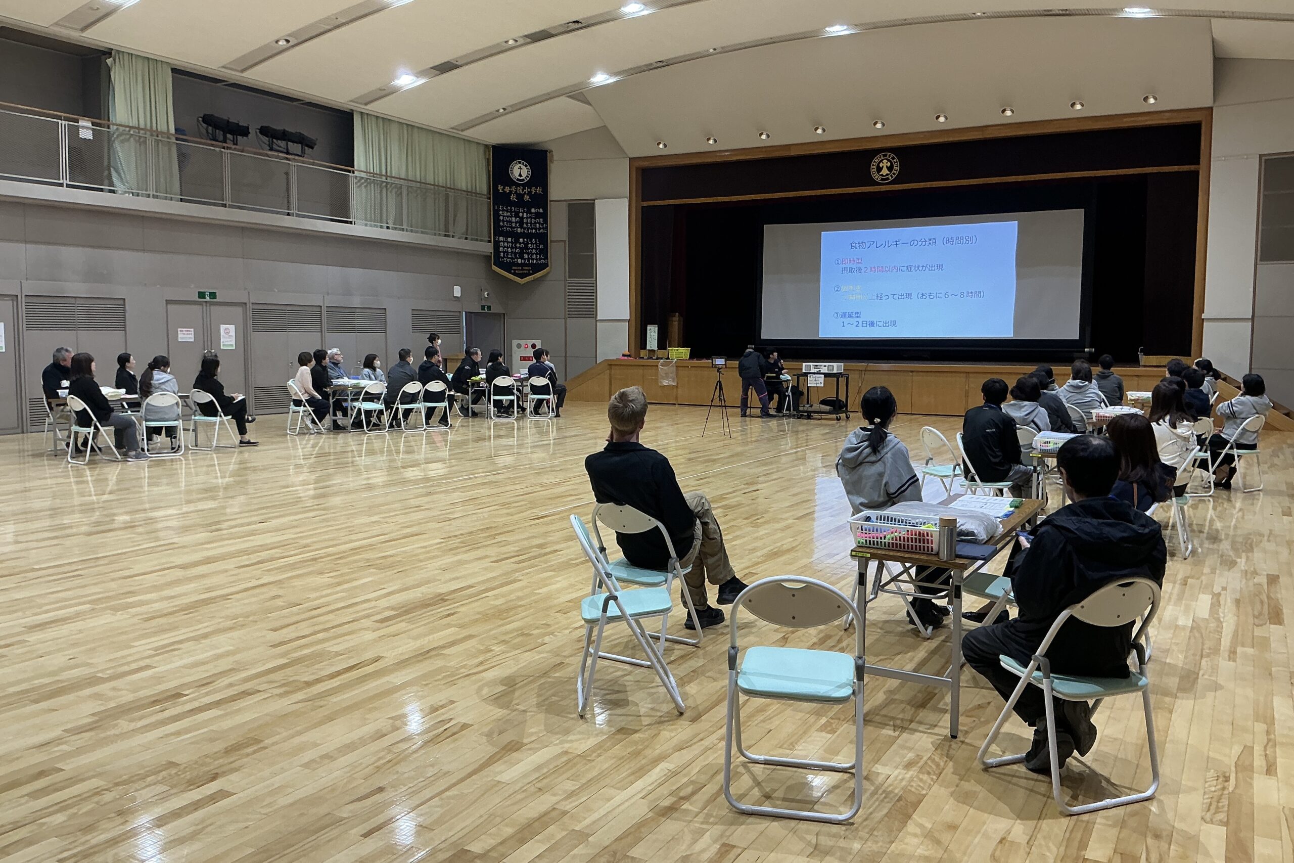 研修の前半は、食物アレルギー(アナフィラキシー含む)の症状やエピペンの使用手順、救急対応の流れについて、講義形式で分かりやすくご説明いただきました。