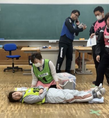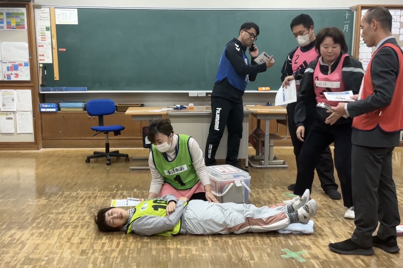 後半は、ロールプレイを中心とした実践的な研修を行いました。児童が倒れた場面を想定し、エピペンの注射から救急要請までを一連の流れで体験する内容で、グループに分かれて役割を交代しながら取り組みました。管理職、養護教諭、担任、応援の教員など、学校内で想定されるさまざまな立場を演じることで、実際の緊急場面で必要となる連携の大切さを改めて確認する機会となりました。