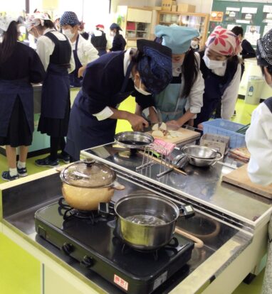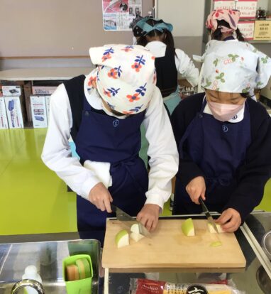 調理台では、具材の大根と油揚げが切られています。1学期に習ったとおり、