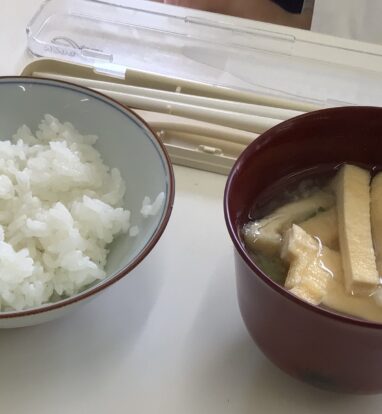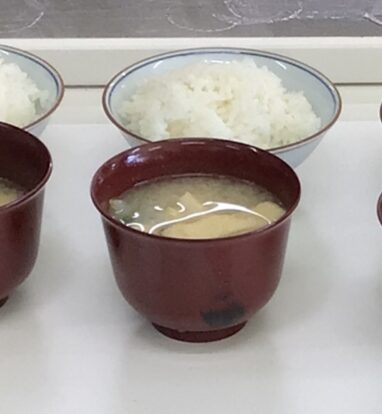 鍋の蓋を開けるとピカピカのお米からほわ~っと湯気が出ています。みそ汁は、
