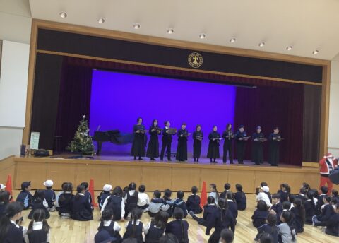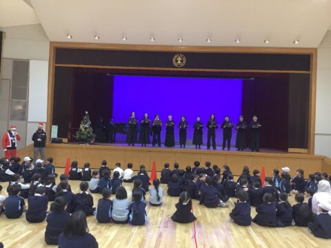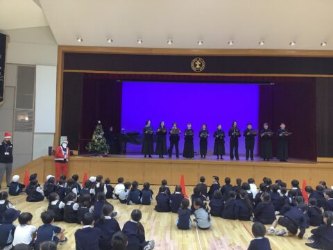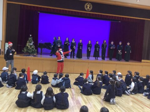 昨年度に引き続き、リスブロン(保護者コーラス)とイングリッシュチャットとのクリスマスコンサートが実現しました。この日のために、リスブロンの団員の方々は練習を重ねてこられ、イングリッシュチャットは、衣装や演出などの準備をしてきました。