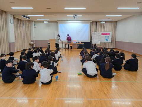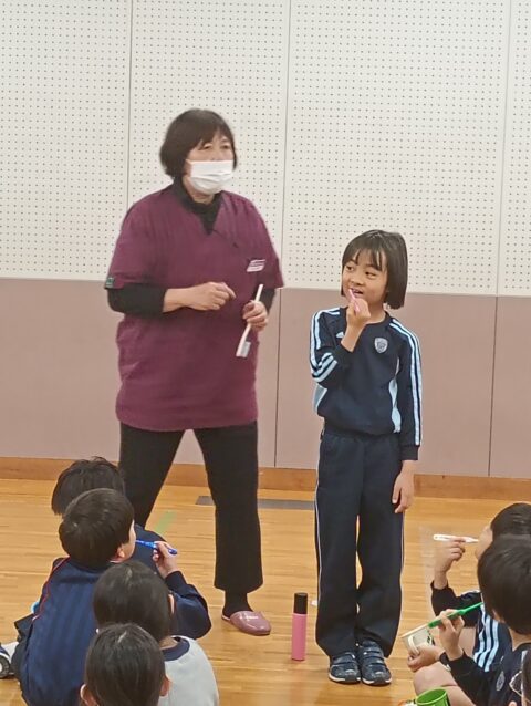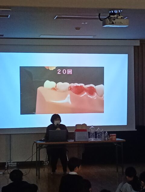 毎年12月に2年生は歯科衛生士の方から「歯と歯磨きについて」のお話と歯磨きの仕方を学びます。